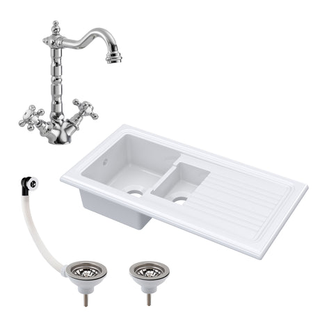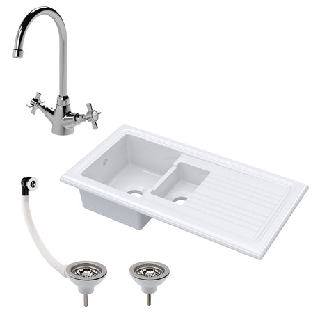 1.5 Bowl Fireclay Inset Kitchen Sink Bundle with Drainer, Mixer Tap & Wastes - 1010mm