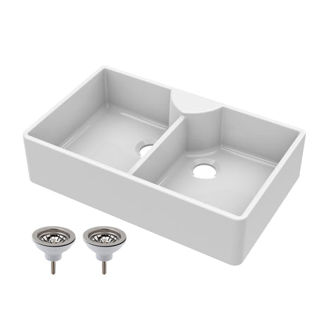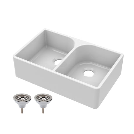 Double Bowl Fireclay Ceramic Butler Kitchen Sink with Stepped Weir & Wastes