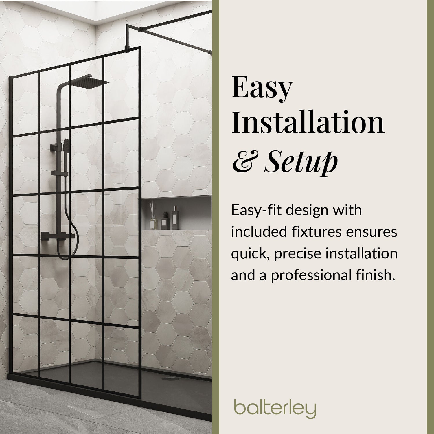 Contemporary 8mm Glass Walk In Wetroom Screens with Matt Black Framed Design and Shower Tray - Choice of Size