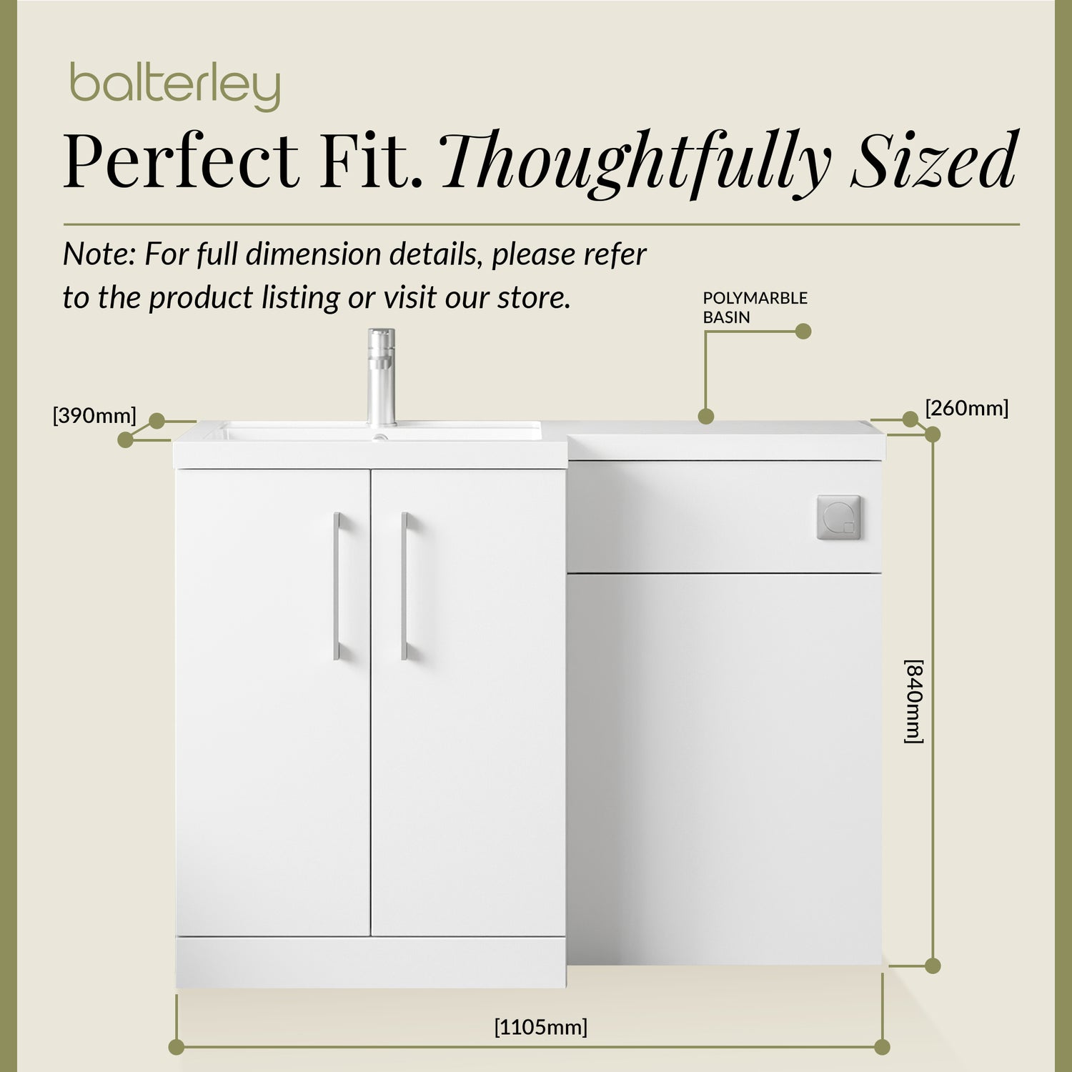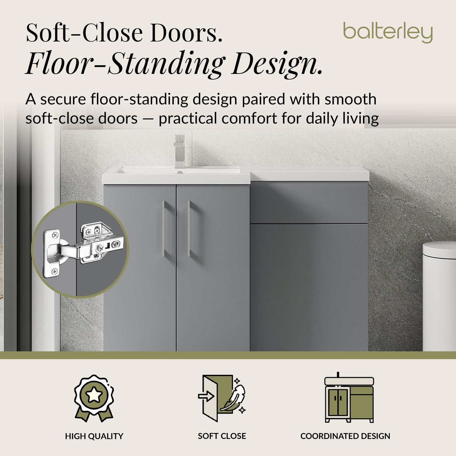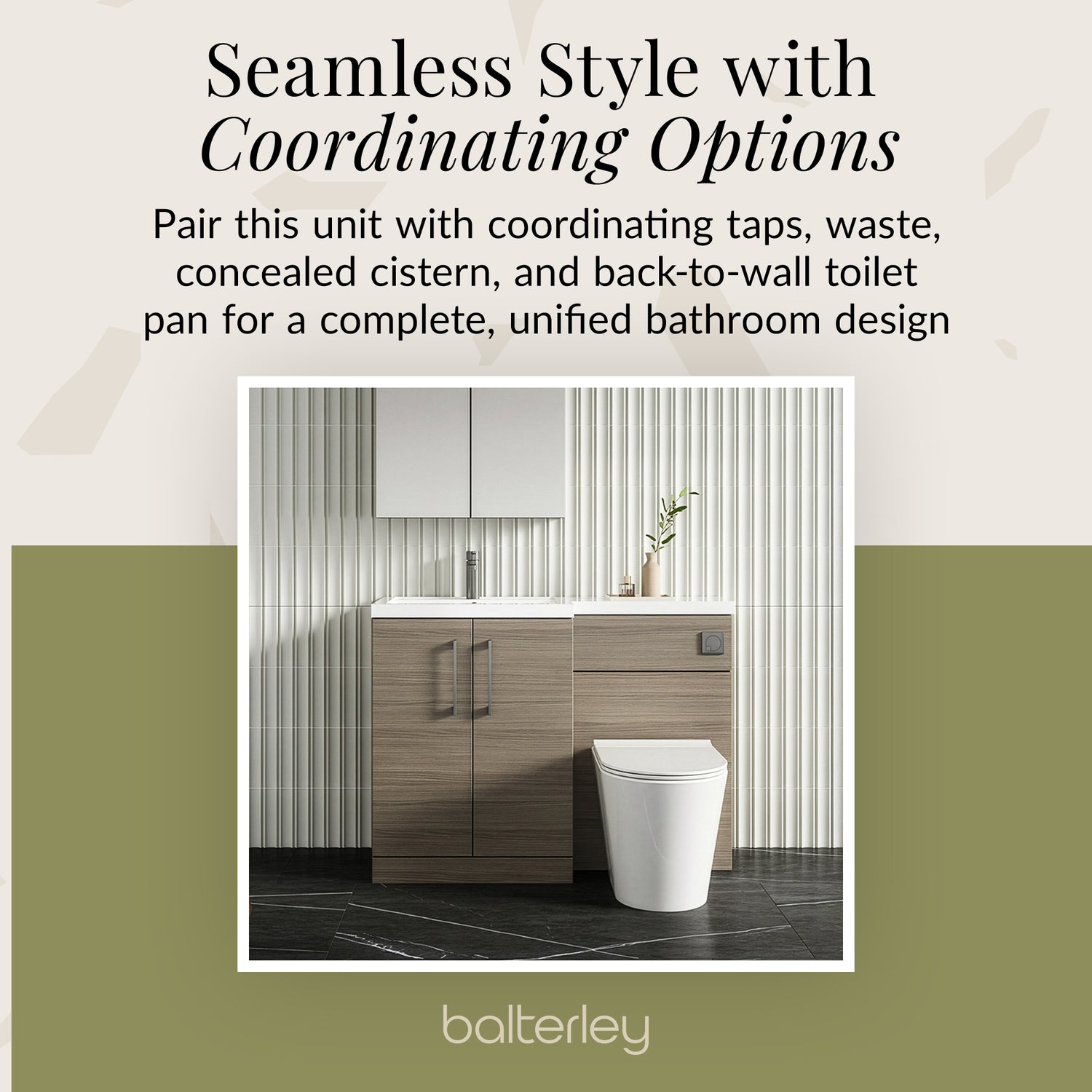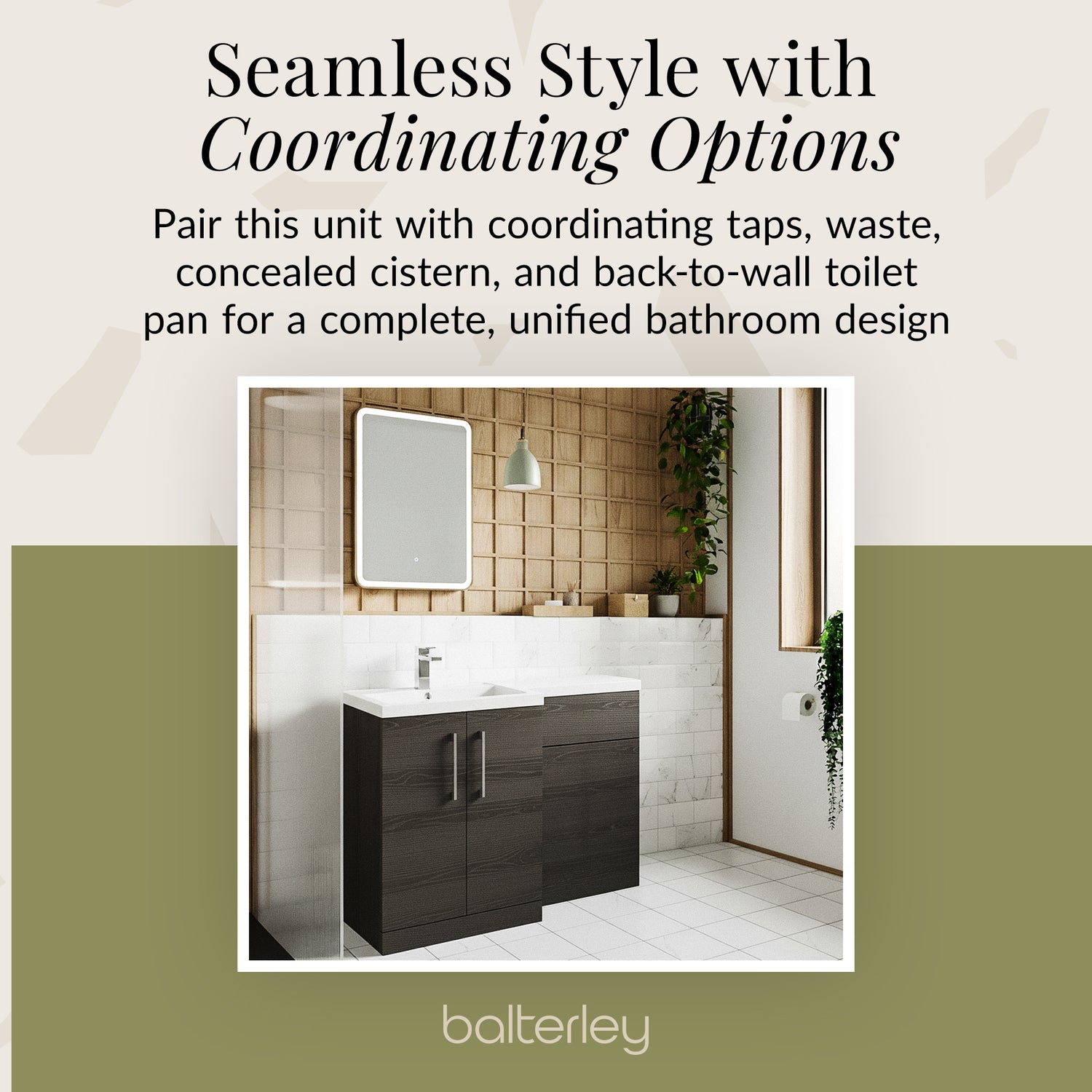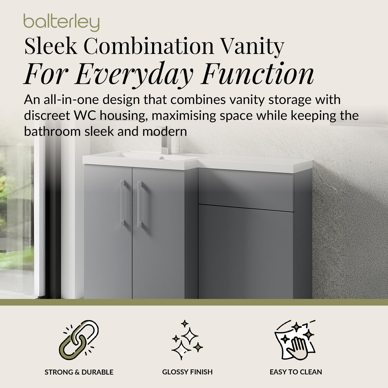 Bring modern elegance and practical storage to your bathroom with the Balterley 1100mm Left-Hand Furniture Combination Vanity Basin and WC Unit collection. Designed for contemporary bathrooms, this unit combines a spacious vanity basin positioned on the left-hand side with integrated WC storage, creating a clean and cohesive look. Available in a wide range of finishes and handle options, it offers both aesthetic appeal and practical performance. Crafted from durable engineered materials, this unit ensures long-lasting functionality while complementing modern, traditional, and transitional interiors.