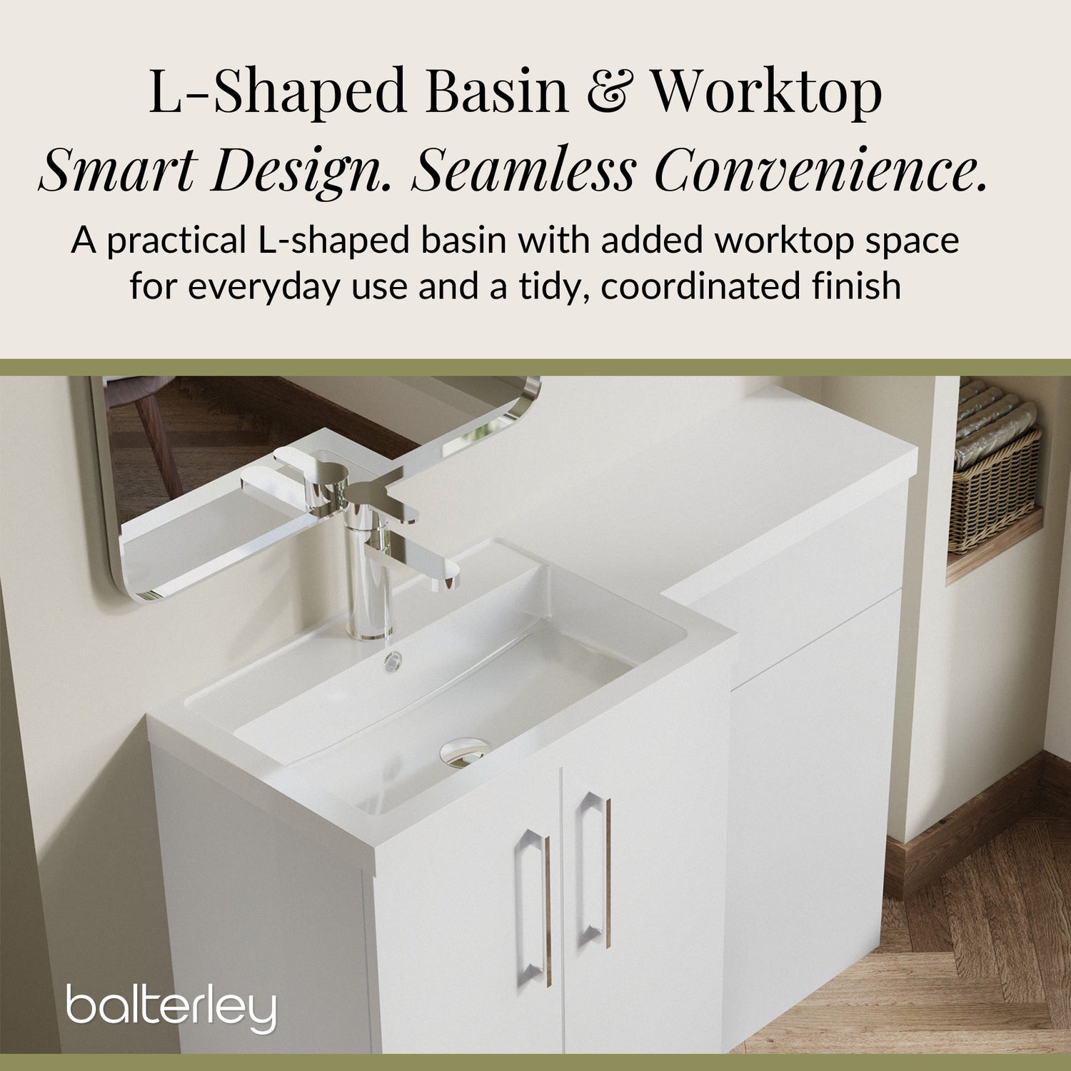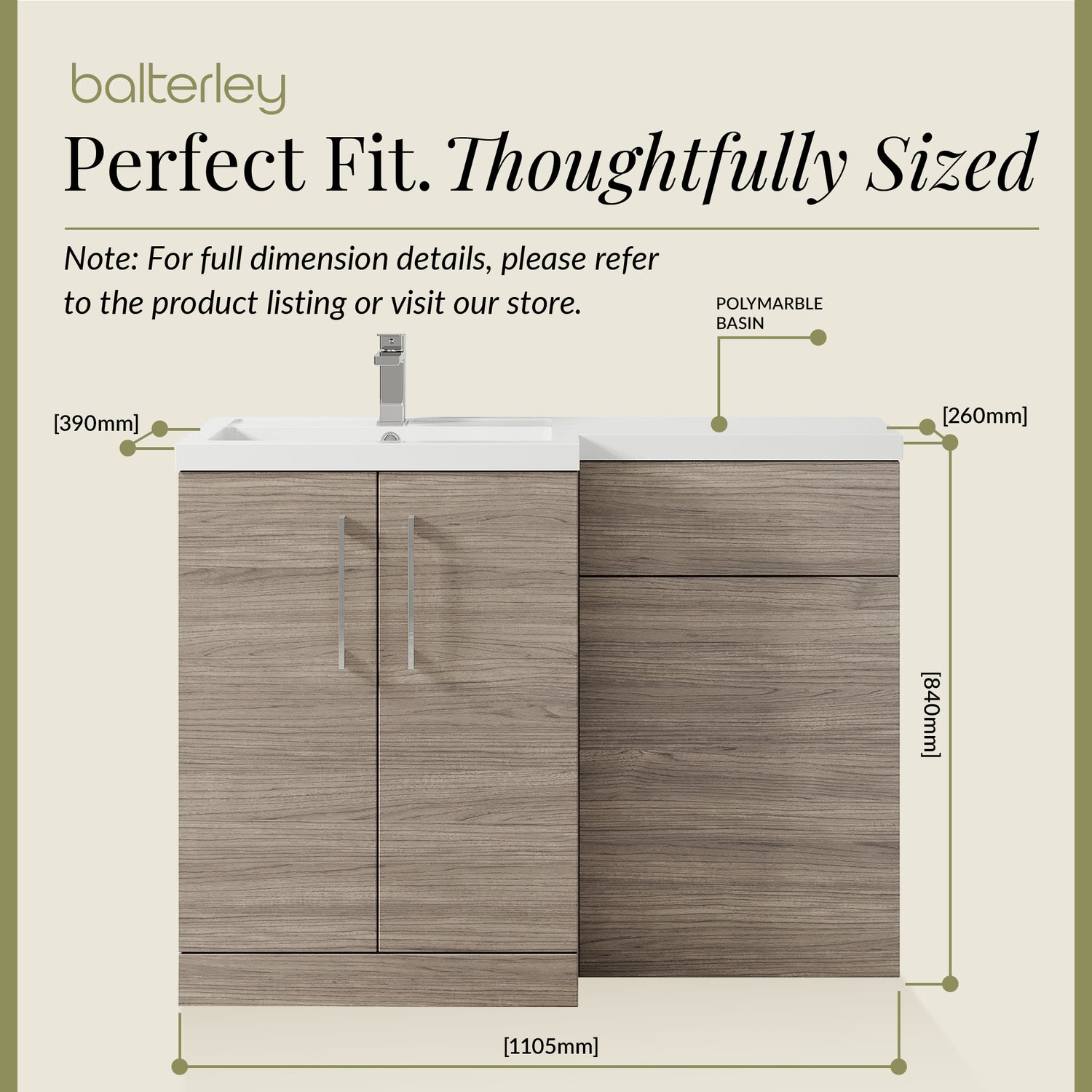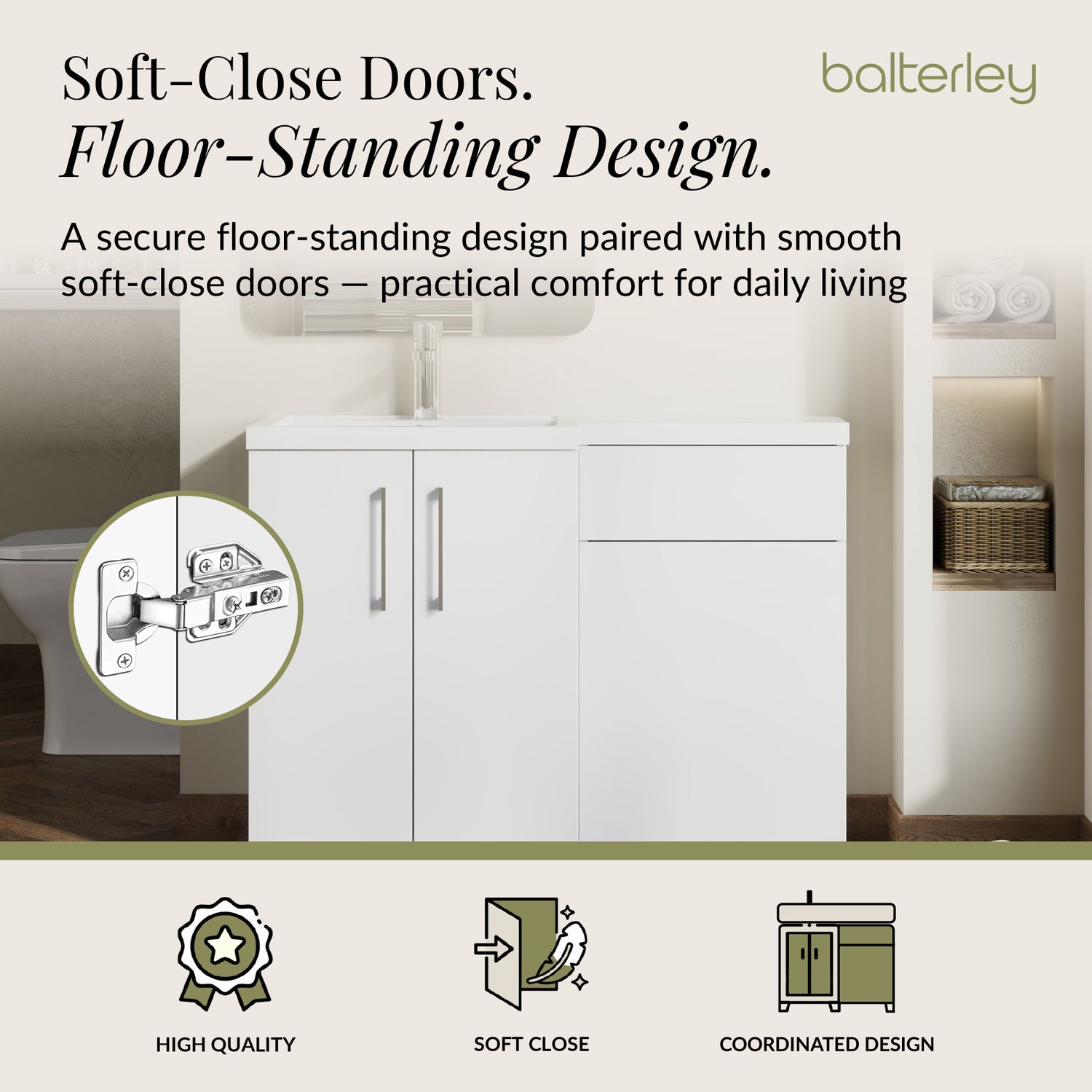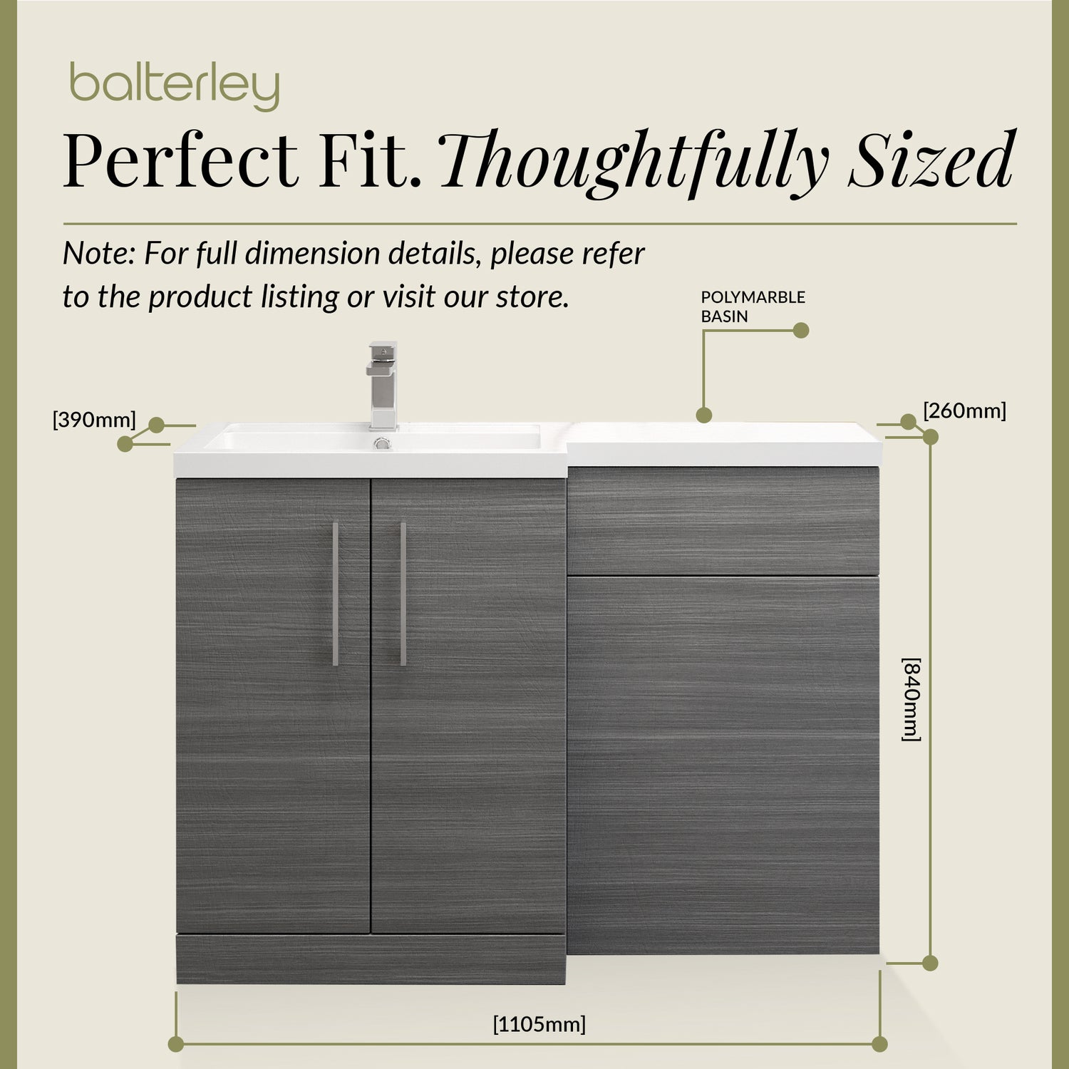 Bring modern elegance and practical storage to your bathroom with the Balterley 1100mm Left-Hand Furniture Combination Vanity Basin and WC Unit collection. Designed for contemporary bathrooms, this unit combines a spacious vanity basin positioned on the left-hand side with integrated WC storage, creating a clean and cohesive look. Available in a wide range of finishes and handle options, it offers both aesthetic appeal and practical performance. Crafted from durable engineered materials, this unit ensures long-lasting functionality while complementing modern, traditional, and transitional interiors.