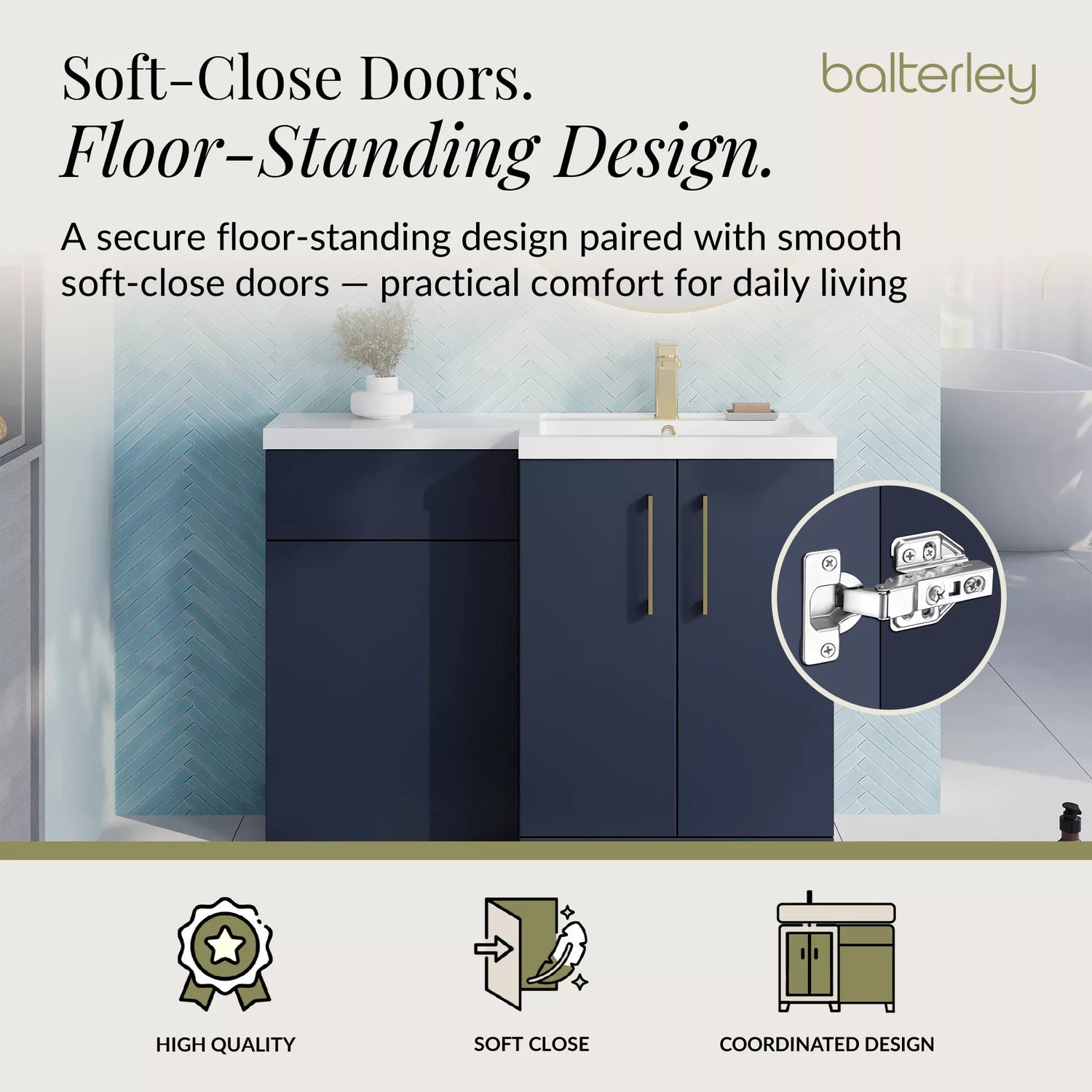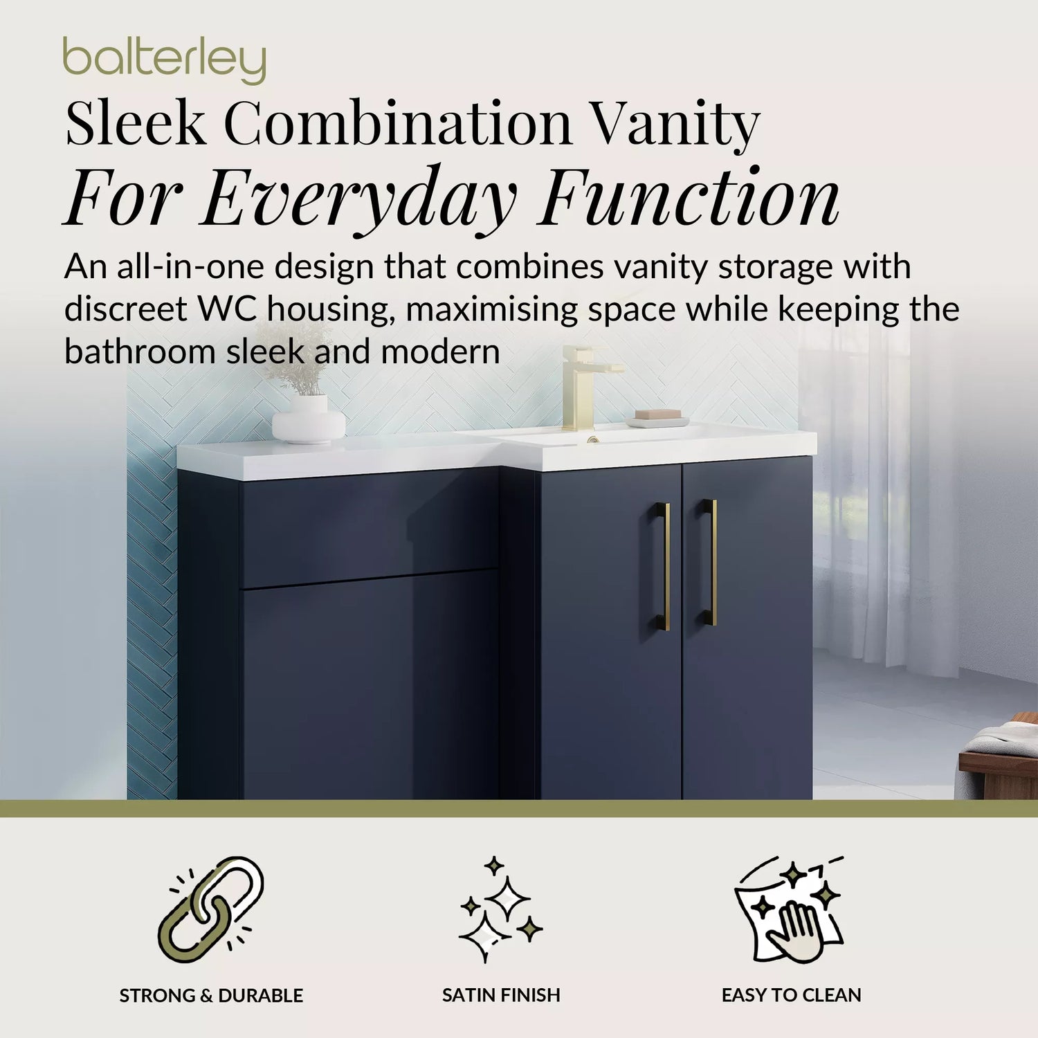 Bring modern elegance and practical storage to your bathroom with the Balterley 1100mm Right-Hand Furniture Combination Vanity Basin and WC Unit collection. Designed for contemporary bathrooms, this unit combines a spacious vanity basin positioned on the right-hand side with integrated WC storage, delivering a streamlined and cohesive finish. Available in a wide range of finishes and handle options, it provides both aesthetic appeal and everyday practicality. Crafted from durable engineered materials, this unit ensures long-lasting functionality while complementing modern, traditional, and transitional interiors.