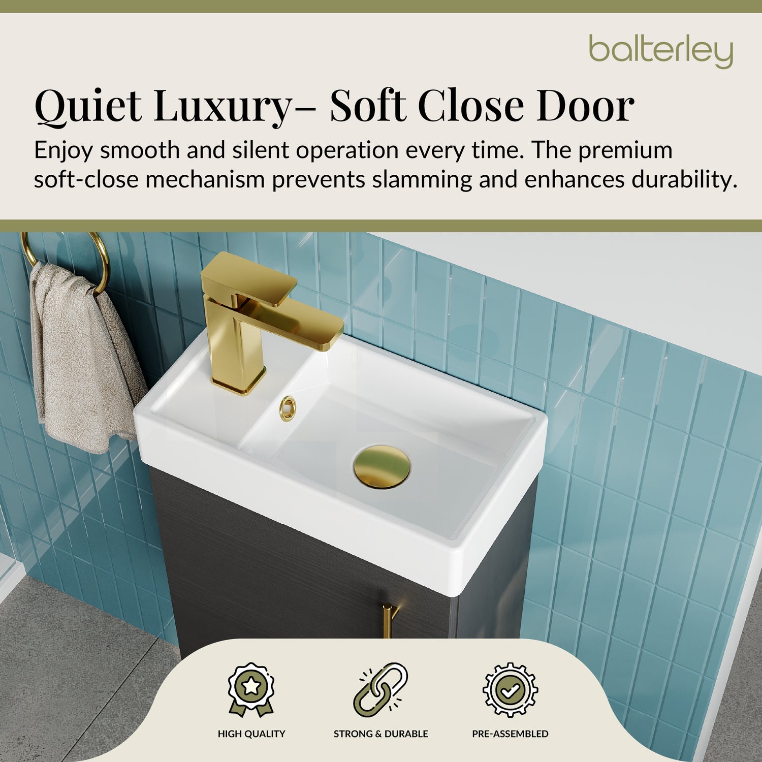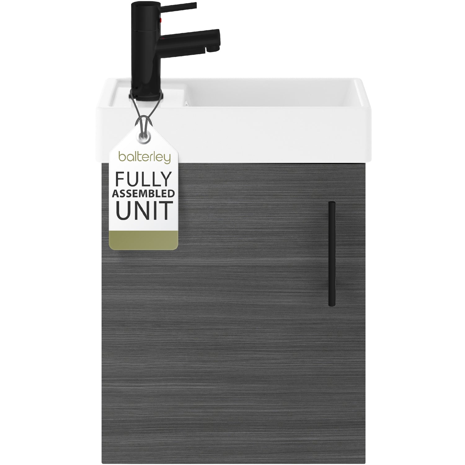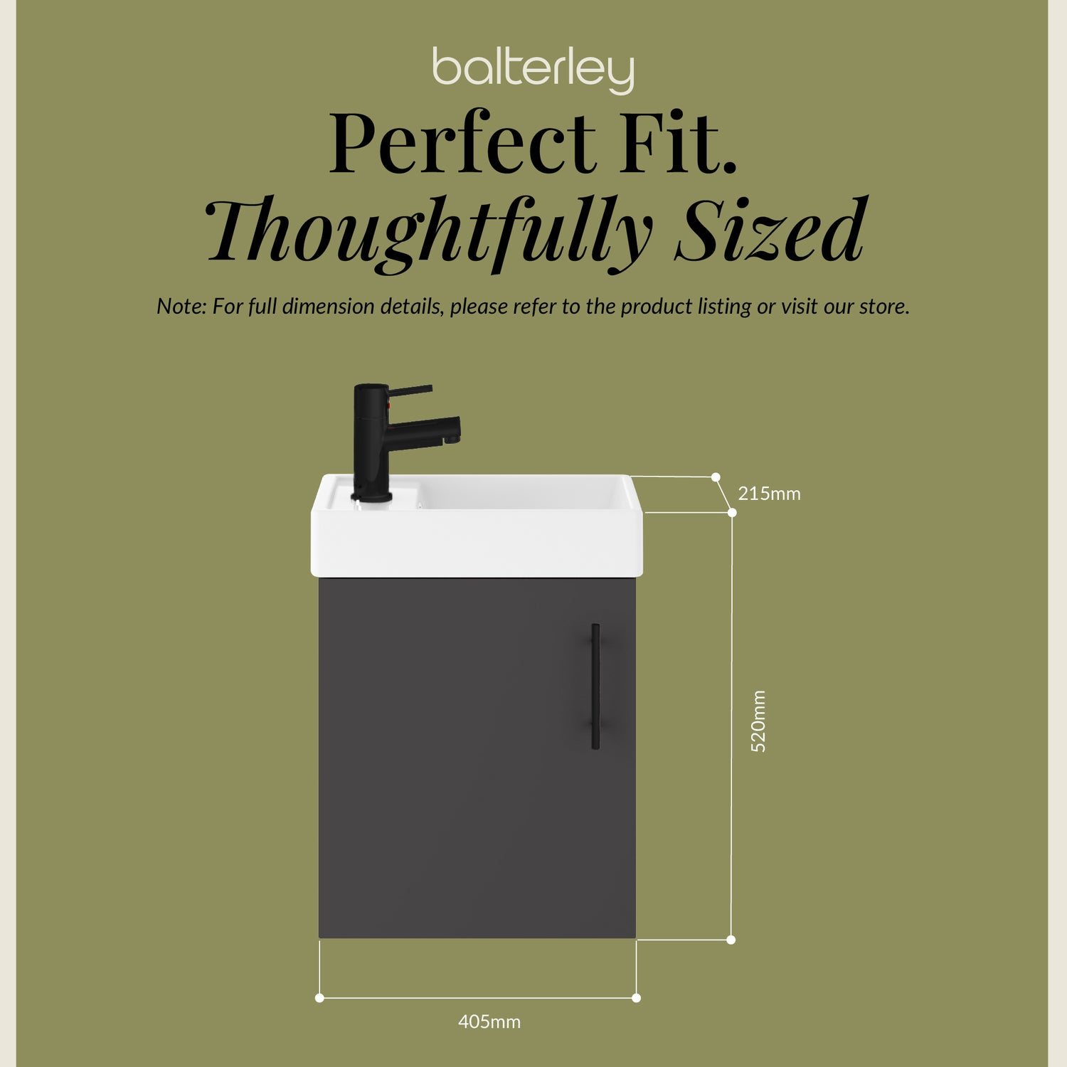 Bring a touch of modern elegance to compact bathrooms, cloakrooms, and en-suites with the Balterley 400mm Vanity Collection. Available in a choice of six on-trend finishes – Woodgrain Anthracite, Woodgrain Black, Gloss Grey, Gloss White, Satin Dark Grey, and Woodgrain Light Oak – each unit is paired with your choice of chrome, black, or brushed brass handles for a personalised finish.