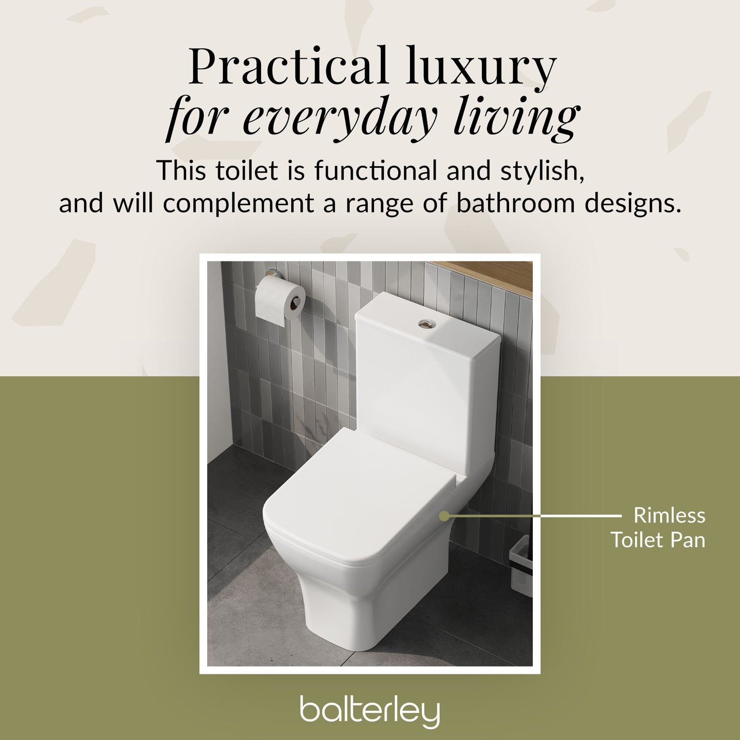Bring calm order and refined style to your bathroom with the Balterley Close-Coupled Toilet. Featuring crisp geometric lines and a compact footprint, this toilet is designed for space-conscious modern bathrooms. The soft-close seat technology ensures quiet, comfortable use every day, while the durable vitreous china construction guarantees long-lasting quality and hygiene. Experience the perfect balance of functional elegance and enduring performance.