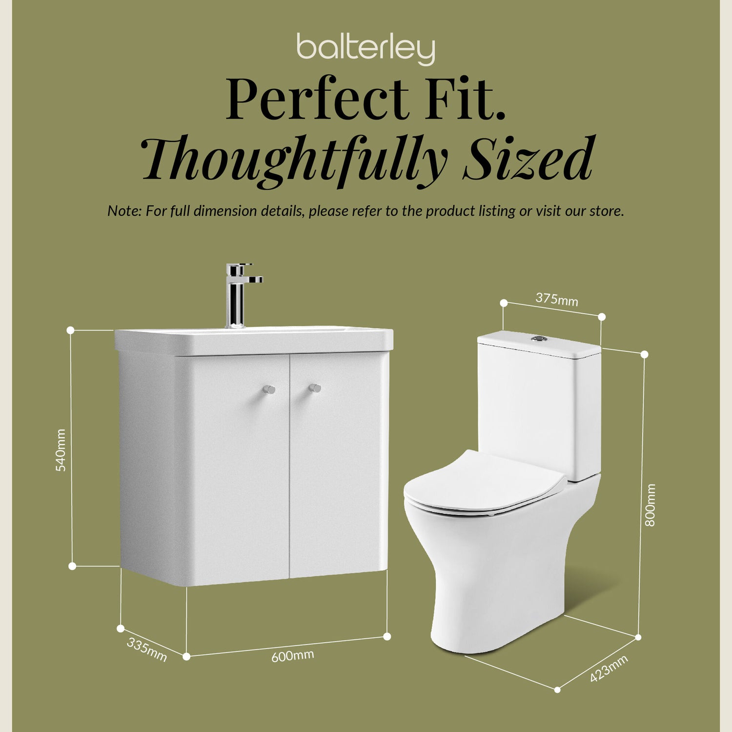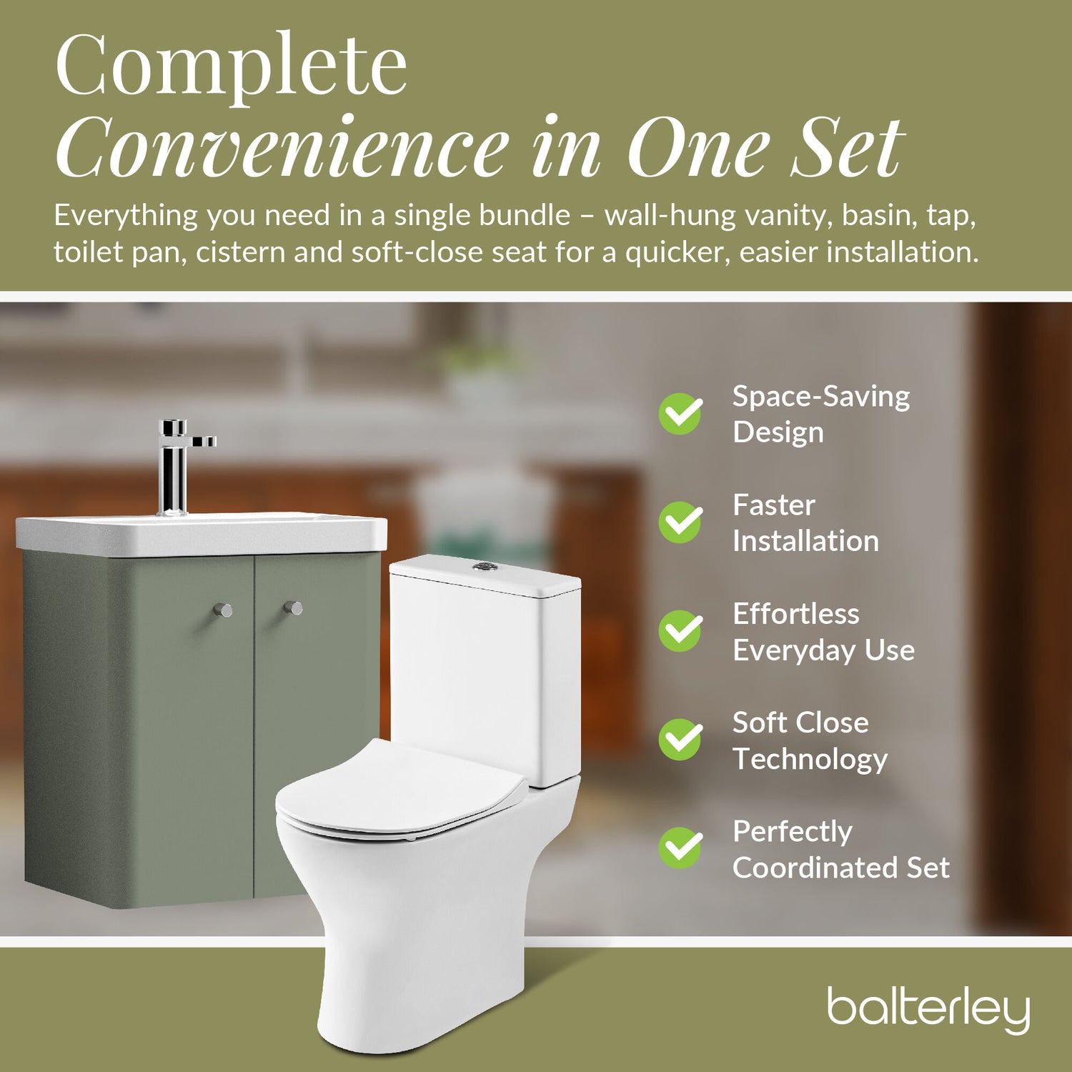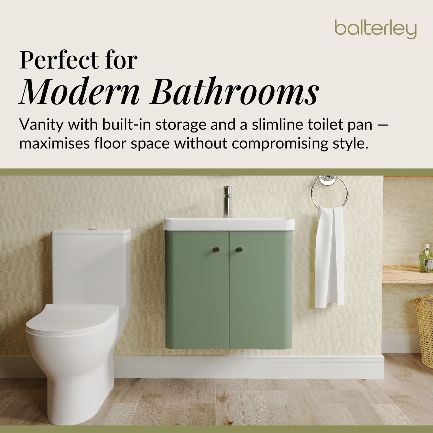 Upgrade your cloakroom or ensuite with the Balterley Wall Hung Vanity, Toilet and Tap Set. Designed for smaller spaces, this bundle pairs a sleek wall-hung vanity with a rimless back-to-wall toilet and concealed cistern, delivering practical storage and modern style without sacrificing floor area. Available in Satin Green, Satin Dark Grey, and Gloss White, with width options of 400mm, 500mm, and 600mm.
