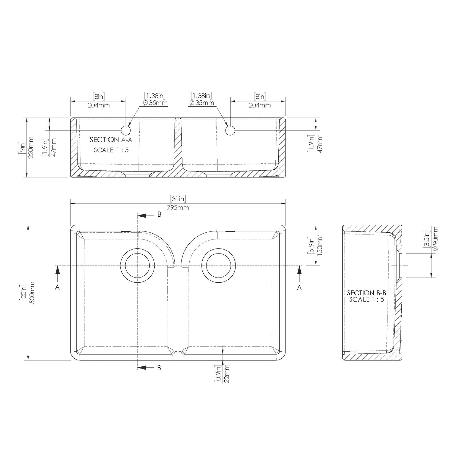 - Sink Dimensions: H: 220 x W: 795 x D: 500mm
