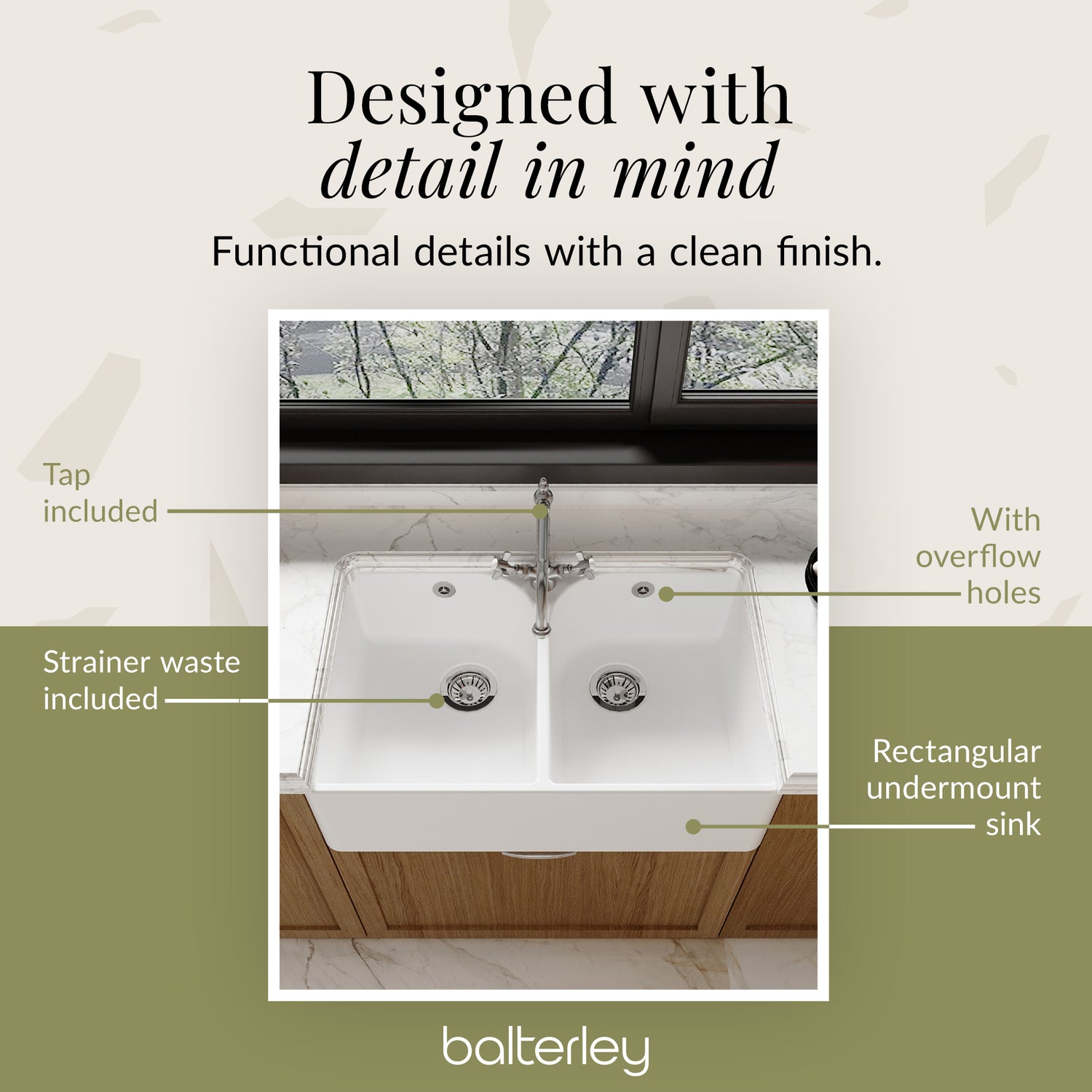 This 795mm Double Bowl Fireclay Butler Kitchen Sink Bundle by Balterley is a true statement of style and function. Handcrafted by Master Potters using time-honoured techniques, the sink features a full flush weir, two overflows, and a single tap hole, all finished in a pristine, non-porous white glaze that resists stains and is easy to clean. The set is completed with a French-inspired Chrome mono tap with crosshead handles and brass internals, paired with a matching Chrome basket strainer waste—bringing together elegance, durability, and effortless coordination.