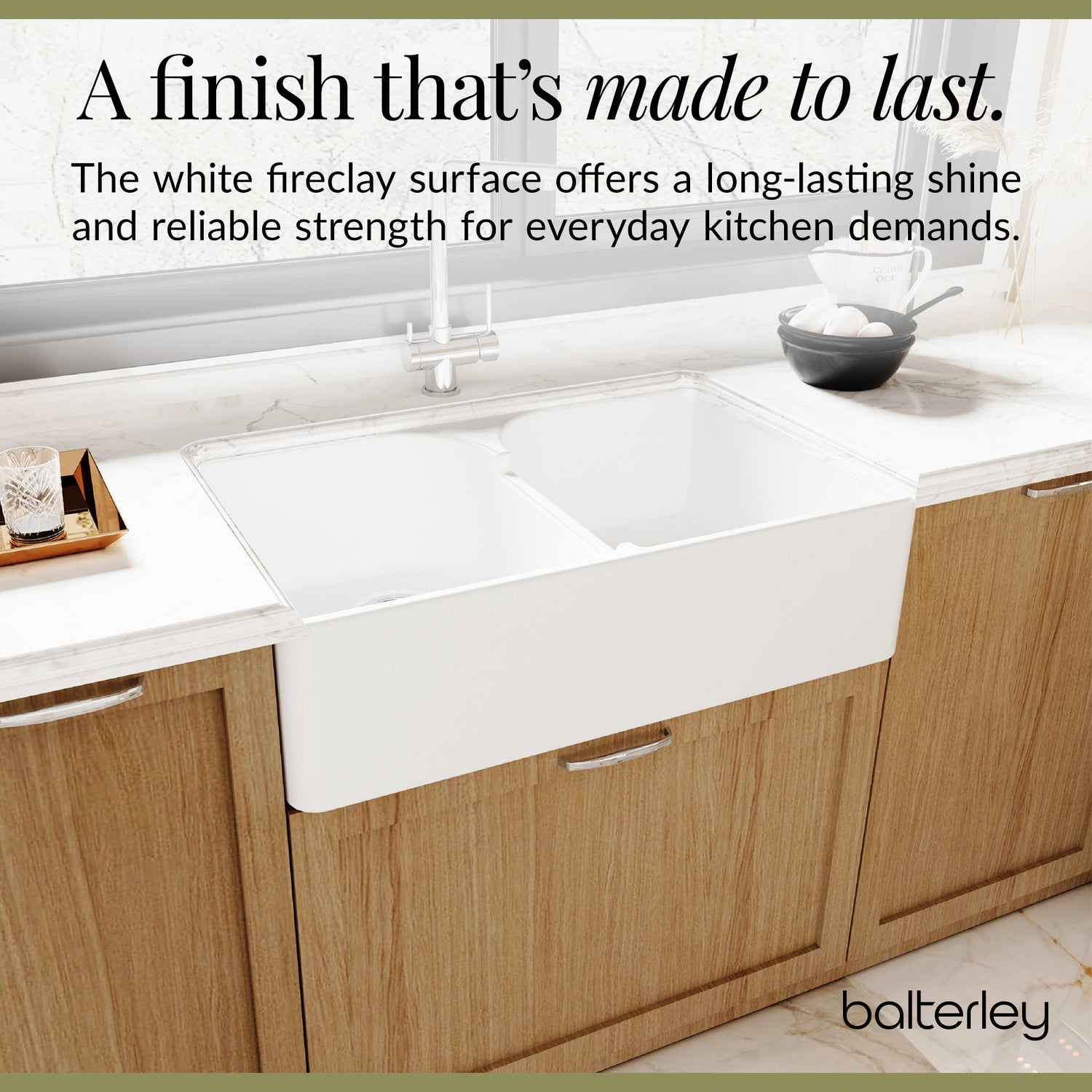 Elevate your kitchen with this exquisite double-bowl Butler sink, meticulously handcrafted by skilled potters using traditional fireclay techniques. Its timeless design beautifully complements both modern and traditional kitchens, while the addition of a stepped weir enhances practicality. The smooth, non-porous white glaze ensures a durable, easy-to-clean surface that maintains its elegance over time. Combining exceptional craftsmanship with premium materials, this sink is a perfect blend of style, functionality, and authenticity.