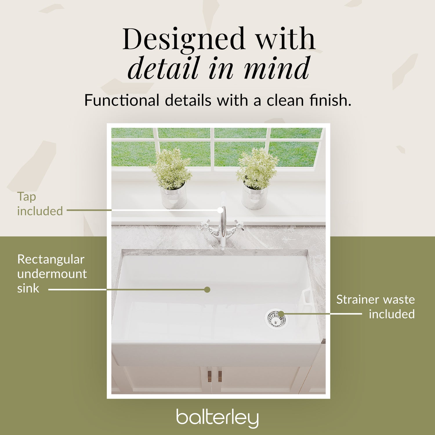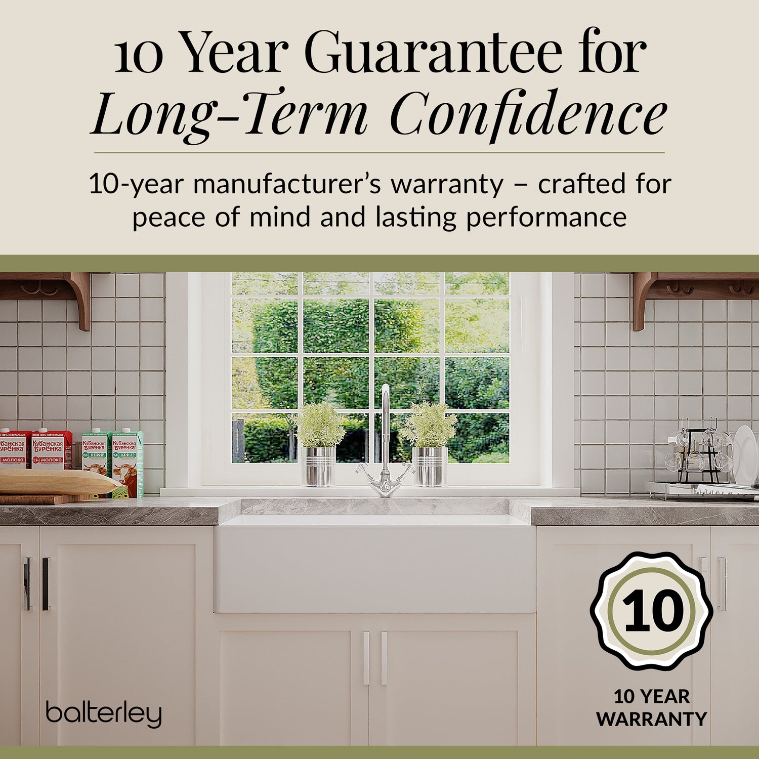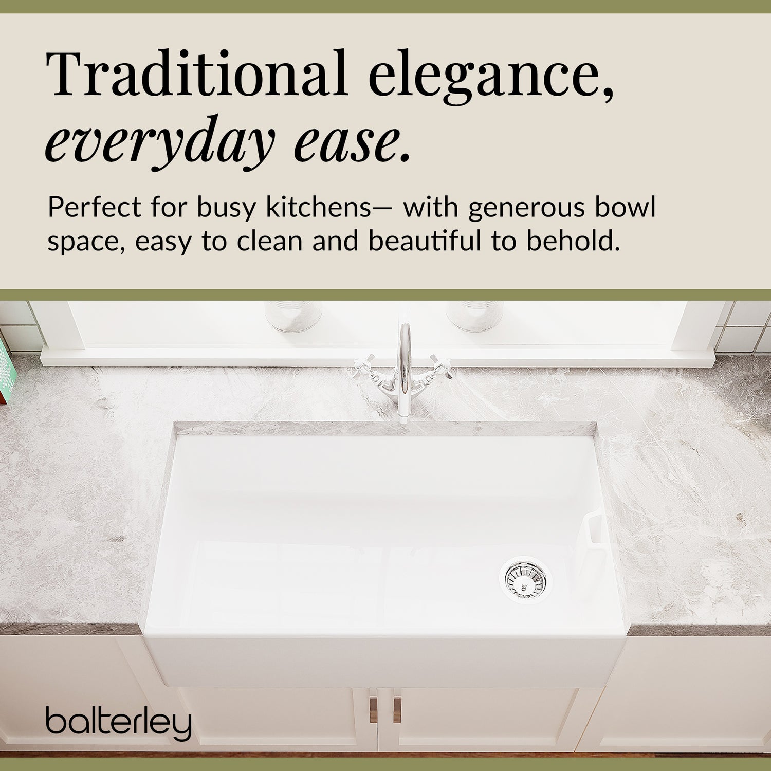 The Balterley 895mm Single Bowl Belfast Kitchen Sink Bundle blends timeless design with dependable performance. Handcrafted from premium fireclay, the spacious bowl is finished with a smooth glaze that resists everyday wear. Paired with a chrome mono crosshead tap and matching basket strainer waste, it offers both style and function in one complete set.