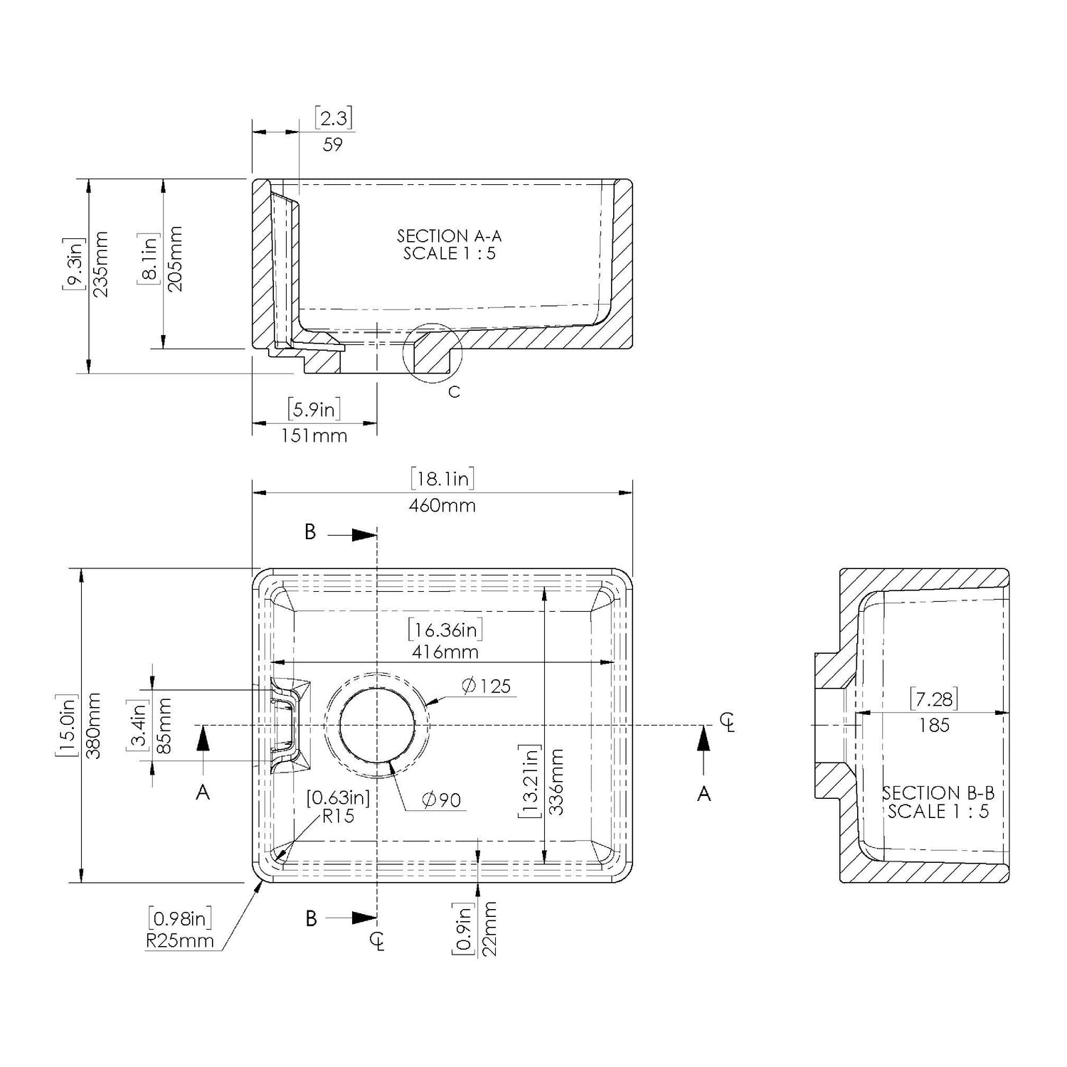 - Inner Bowl Dimensions: H 185mm x W 416mm x D 336mm
