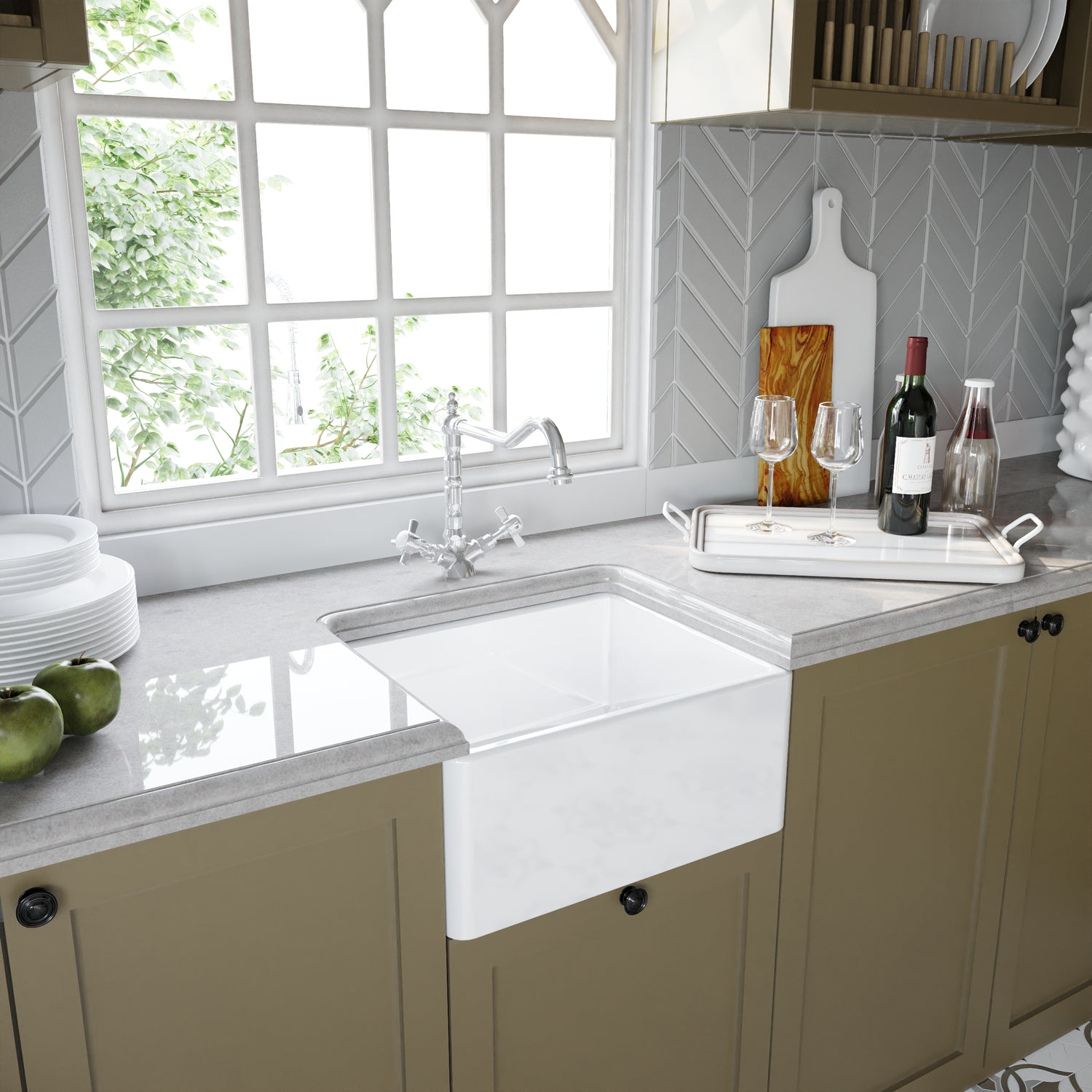 Single Bowl Fireclay Ceramic Belfast Sink Bundle with Overflow, French Mixer Tap & Strainer Waste