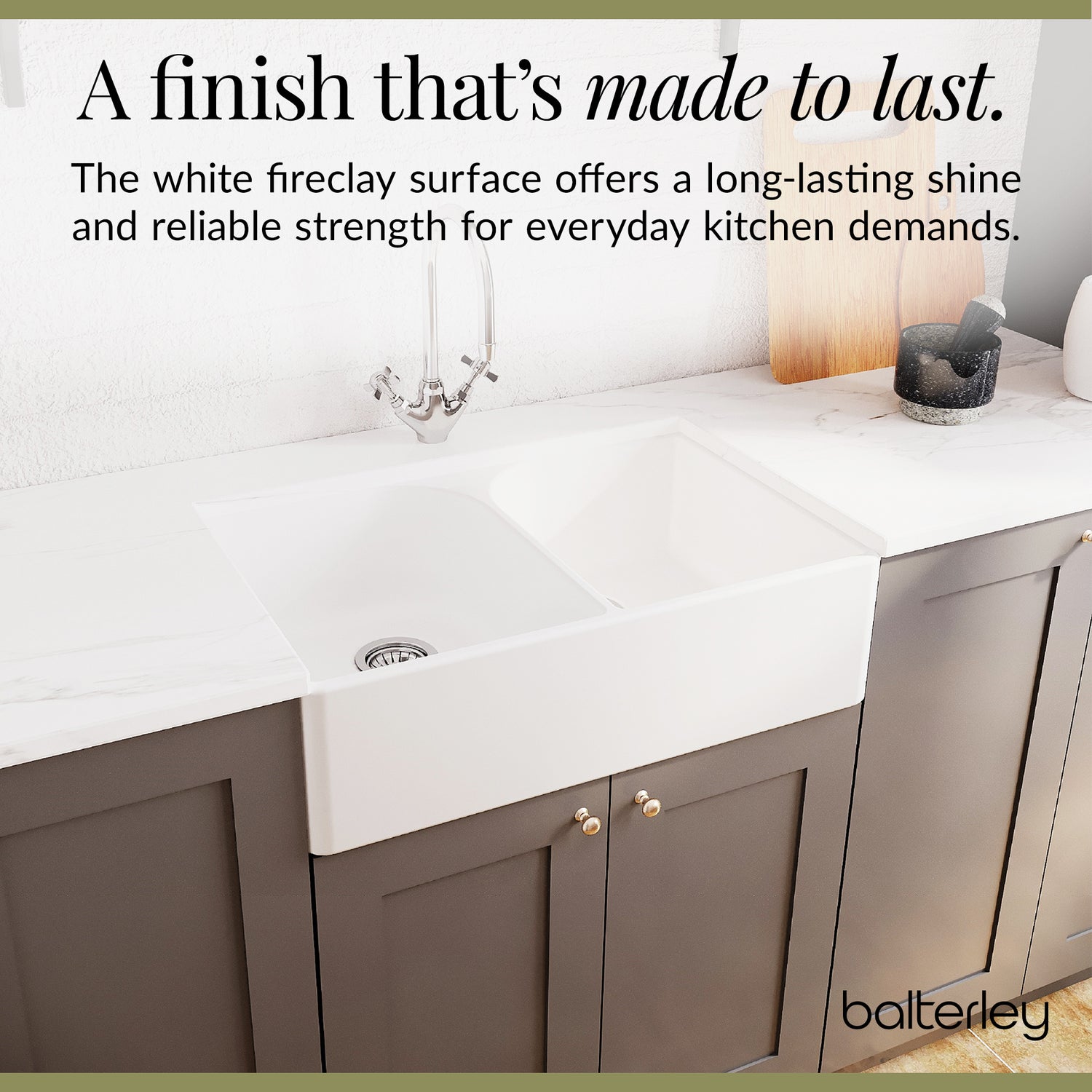 - Superior Craftsmanship: Handfinished Fireclay offers a hardwearing, stain-resistant, non-porous surface built to last.