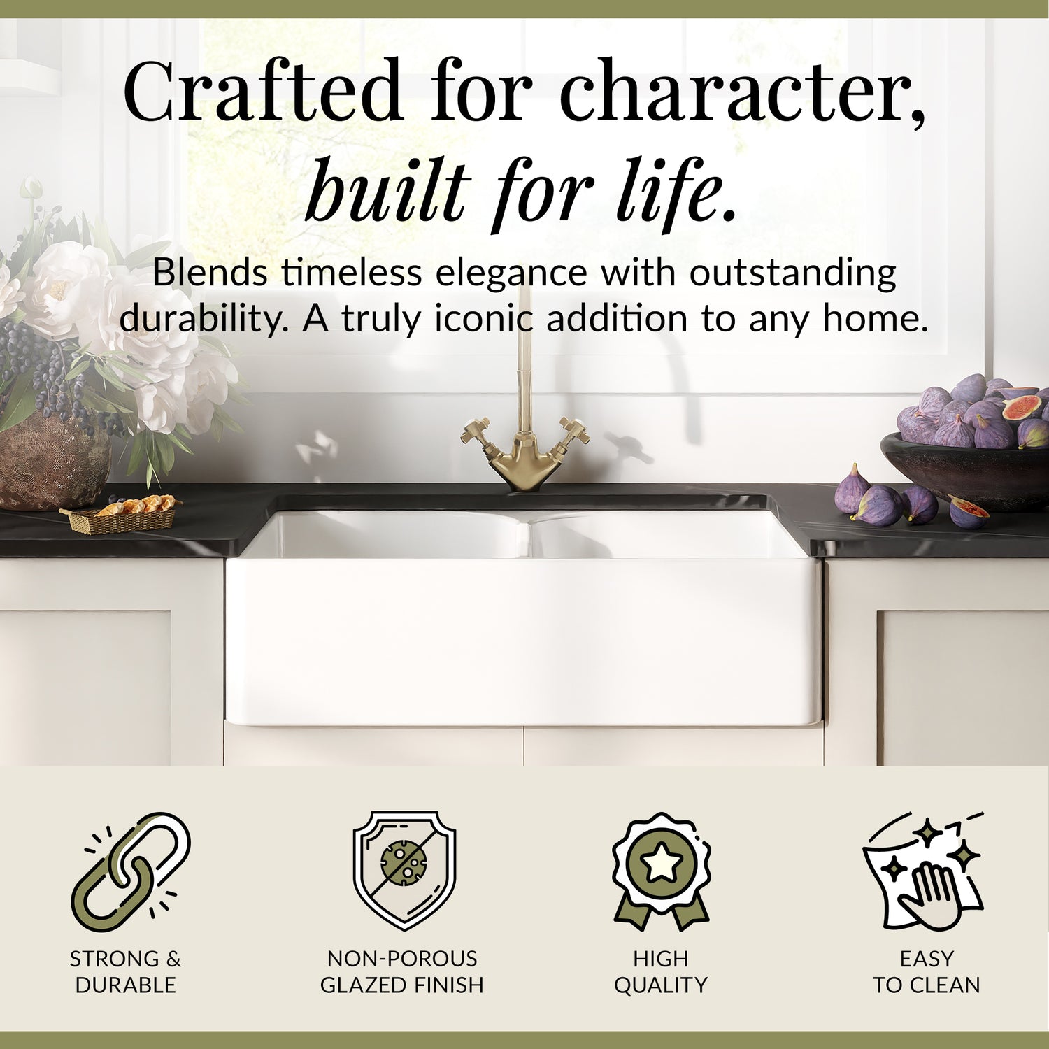 Elevate your kitchen with this exquisite double-bowl Butler sink, meticulously handcrafted by skilled potters using traditional fireclay techniques. Its timeless design beautifully complements both modern and traditional kitchens, while the addition of a stepped weir enhances practicality. The smooth, non-porous white glaze ensures a durable, easy-to-clean surface that maintains its elegance over time. Combining exceptional craftsmanship with premium materials, this sink is a perfect blend of style, functionality, and authenticity.