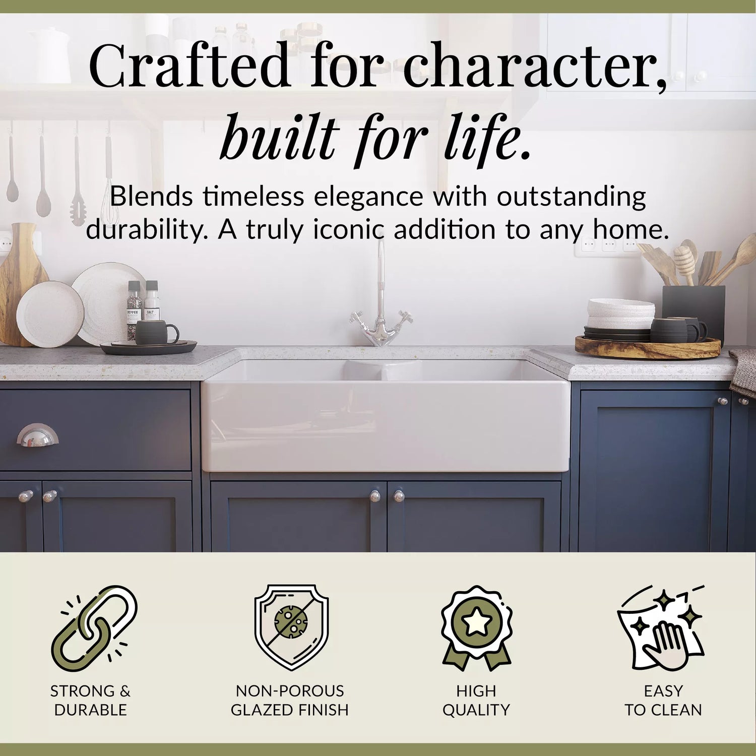 Double Bowl Fireclay Ceramic Butler Kitchen Sink Bundle with Stepped Weir, Mixer Tap & Wastes