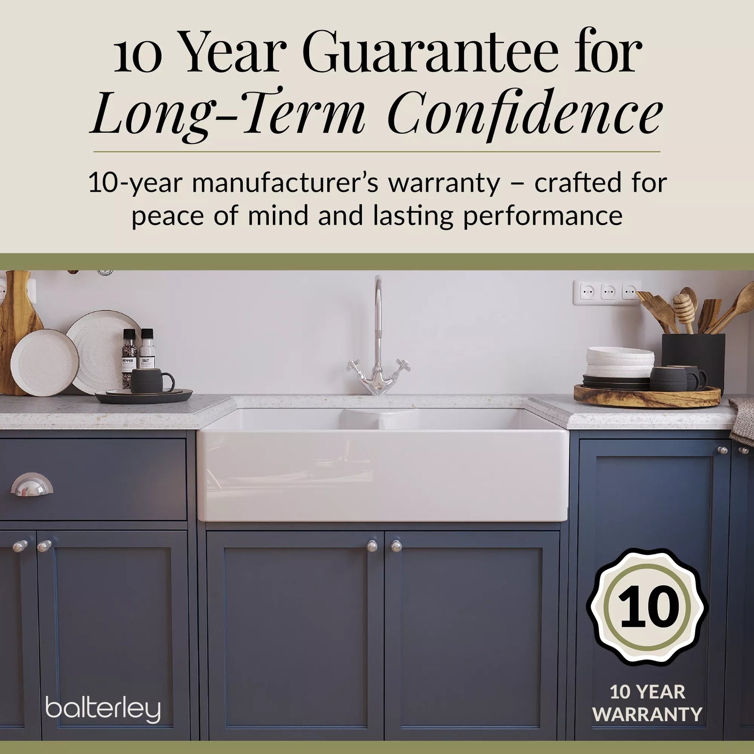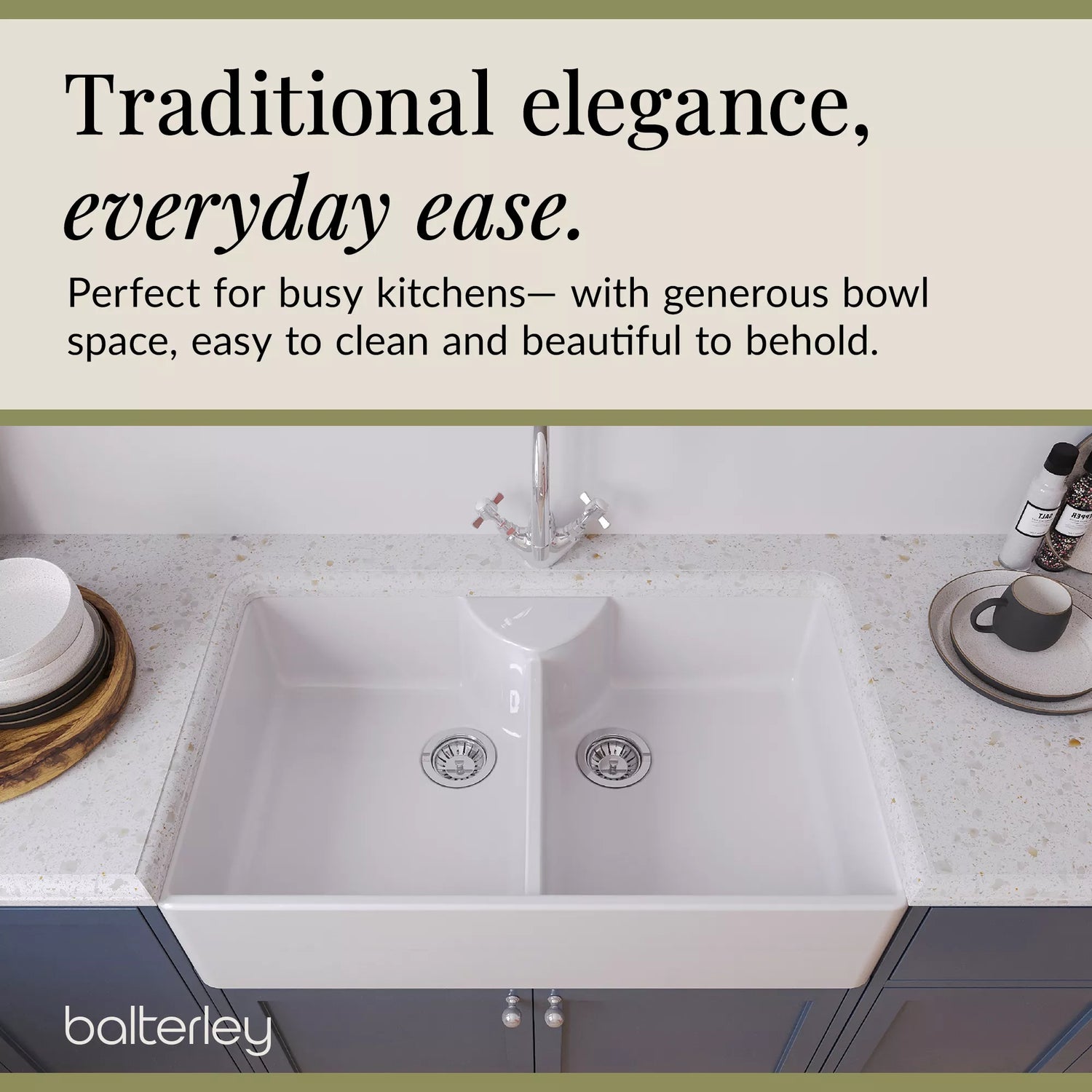 Enhance your kitchen with the 895mm Double Bowl Fireclay Butler Sink Bundle from Balterley. Handcrafted by Master Potters using traditional fireclay techniques, the sink features a smooth, pristine white glaze and classic stepped weir design, blending enduring elegance with practical durability. The bundle includes a Brushed Brass bridge crosshead tap with high-quality brass internals and ceramic disc technology for precise, reliable water control. Two matching 90mm Brushed Brass basket strainer wastes complete the set, offering a coordinated, stylish, and highly functional kitchen solution.