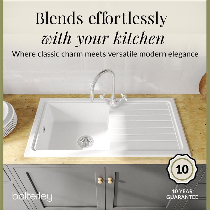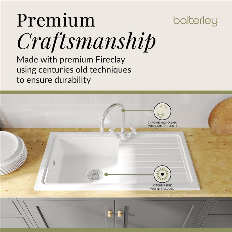 The Balterley 1010mm Single Bowl Countertop Belfast Sink Bundle combines traditional craftsmanship with modern practicality. Handmade from fireclay, the sink is finished with a smooth, glossy white glaze that resists stains, heat, and daily wear. Its reversible inset design includes an integrated drainer with gentle grooves to keep your worktop tidy. Paired with a chrome mono crosshead tap featuring ceramic disc technology, plus a matching basket strainer waste with overflow, this bundle delivers a coordinated, easy-to-install kitchen upgrade.