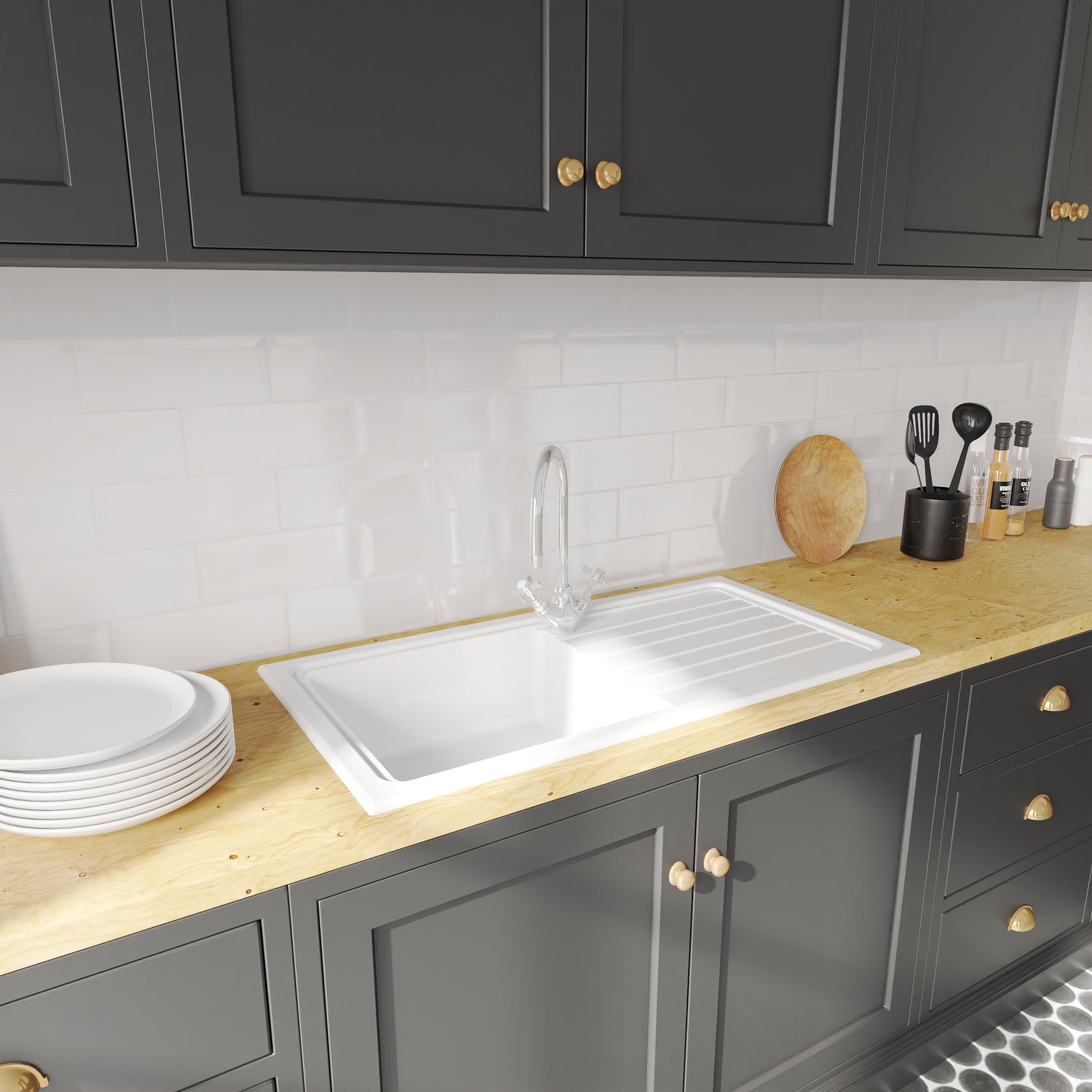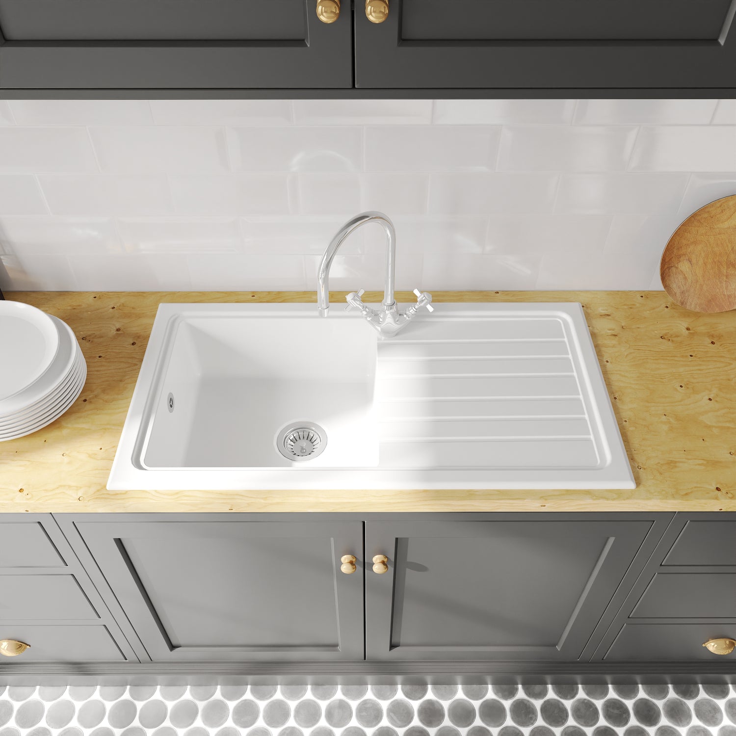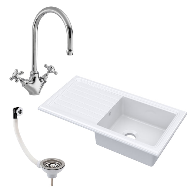 - Materials: White glazed fireclay ceramic sink, chrome tap, stainless steel waste