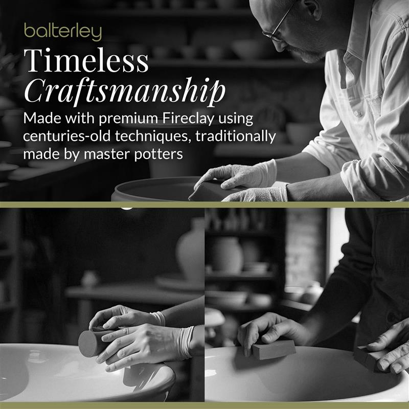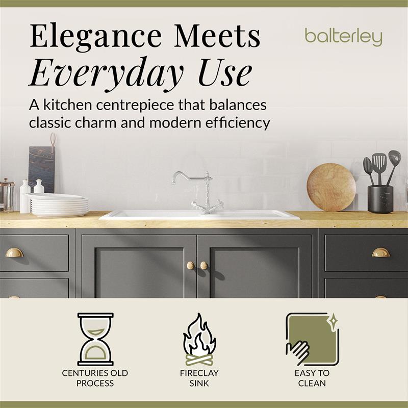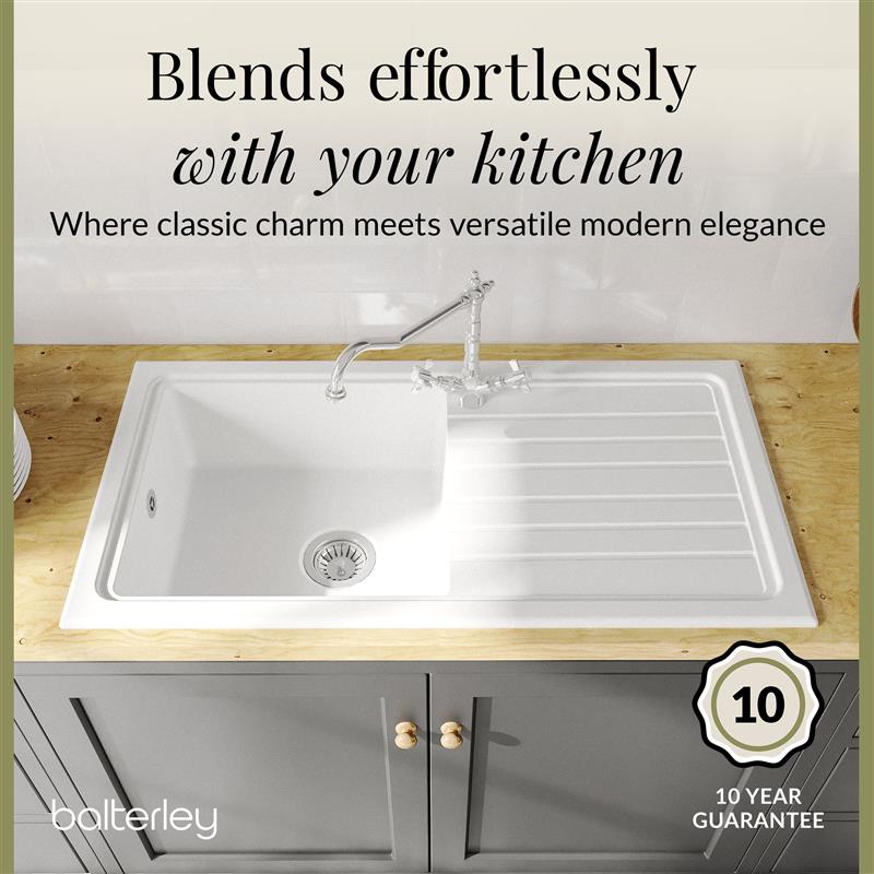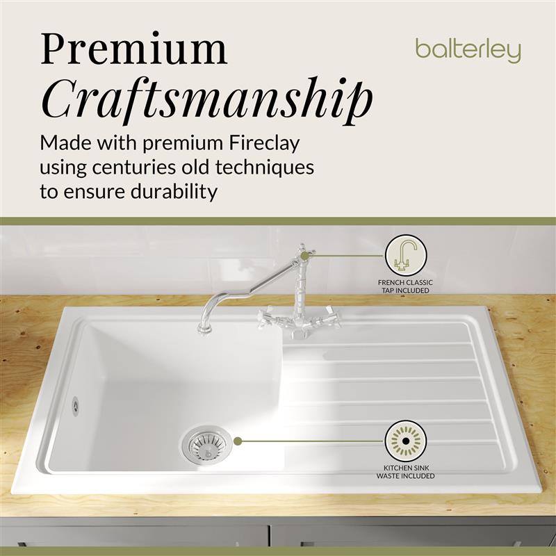 The Balterley 1010mm Single Bowl Countertop Belfast Sink Bundle combines traditional fireclay craftsmanship with modern practicality. Finished in a glossy white glaze that resists stains, heat, and wear, the spacious single bowl is complemented by a reversible inset design and gently grooved drainer. Paired with a chrome French-style mono crosshead tap featuring ceramic disc technology, plus a matching basket strainer waste with overflow, this bundle delivers a timeless and coordinated kitchen solution.