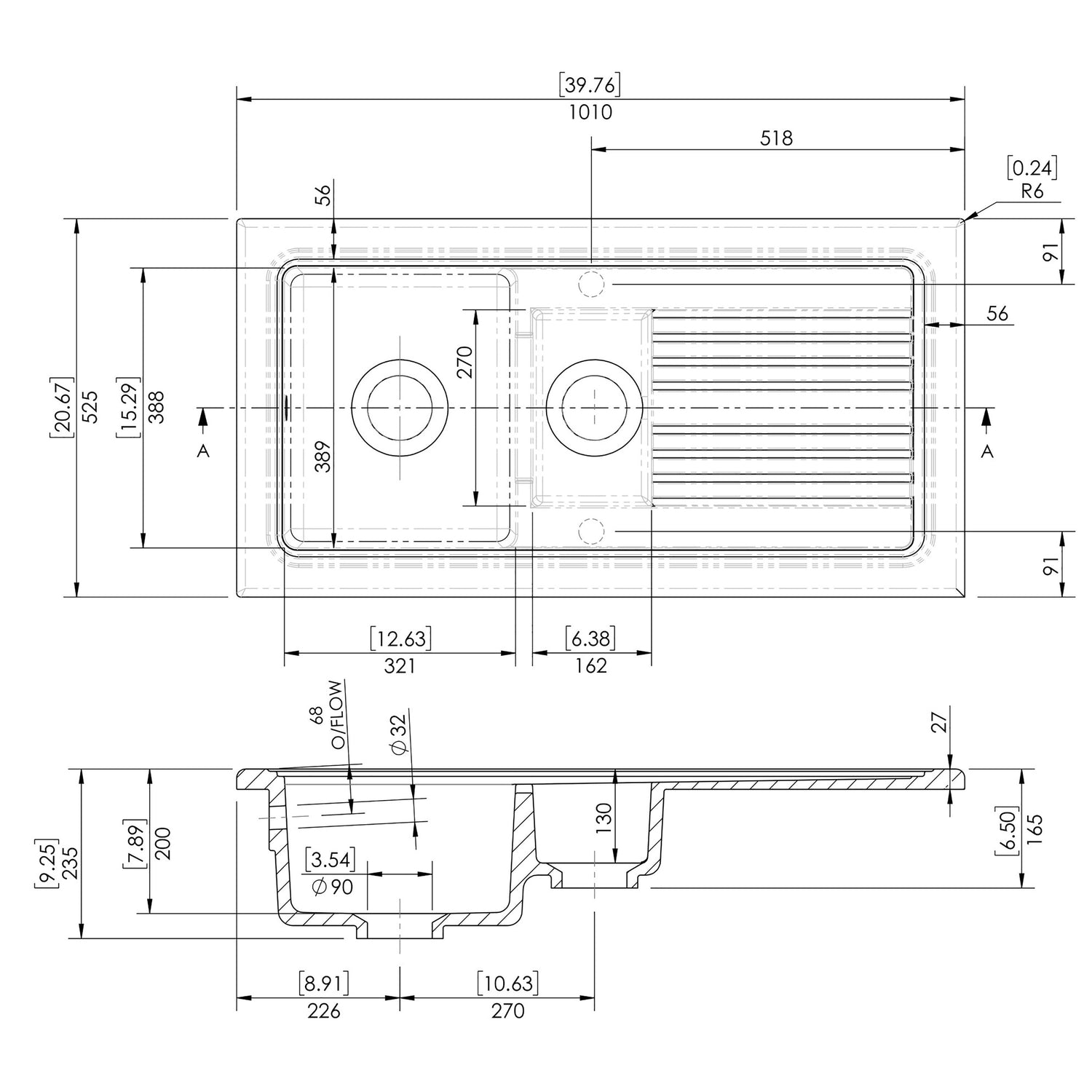 - Basin Dimensions: H 235mm x W 1010mm x D 525mm