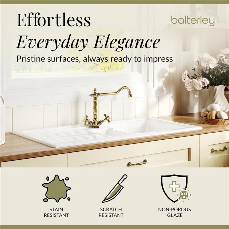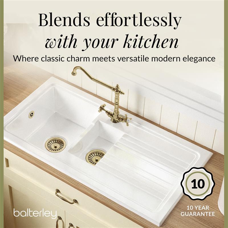 Elevate your kitchen with traditional craftsmanship that meets everyday practicality. Handcrafted from premium fireclay, the 1.5 bowl sink features a smooth, non-porous glaze that resists stains, heat, and wear. Designed for inset installation with a built-in overflow, the reversible waste allows flexible placement to suit your kitchen layout. A brushed brass bridge crosshead mono tap with ceramic disc technology completes this coordinated and stylish bundle, along with matching basket strainer wastes.