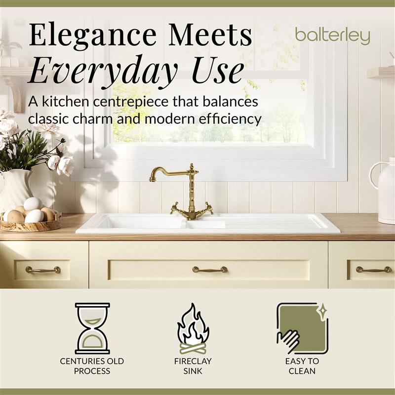 This Balterley Fireclay Dual Bowl Sink Bundle combines generous workspace, timeless style, and refined hardware, creating a functional and elegant kitchen feature that will endure daily use while enhancing your home’s heart with classic charm.