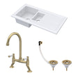 Fireclay Kitchen Bundle - 1.5 Bowl Sink & Drainer, Waste & Bridge Lever Tap, 1010mm - Brushed Brass