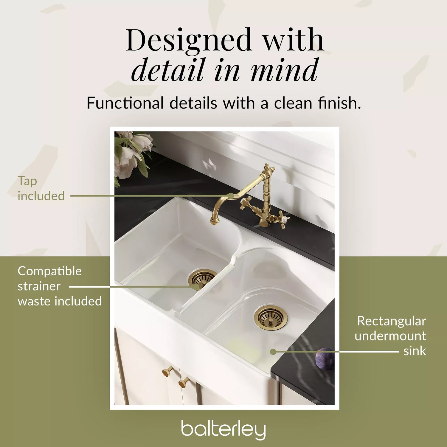 Title Fireclay Kitchen Bundle - Double Bowl Stepped Weir Butler Sink, Wastes & French Classic Tap, 795mm - Brushed Brass