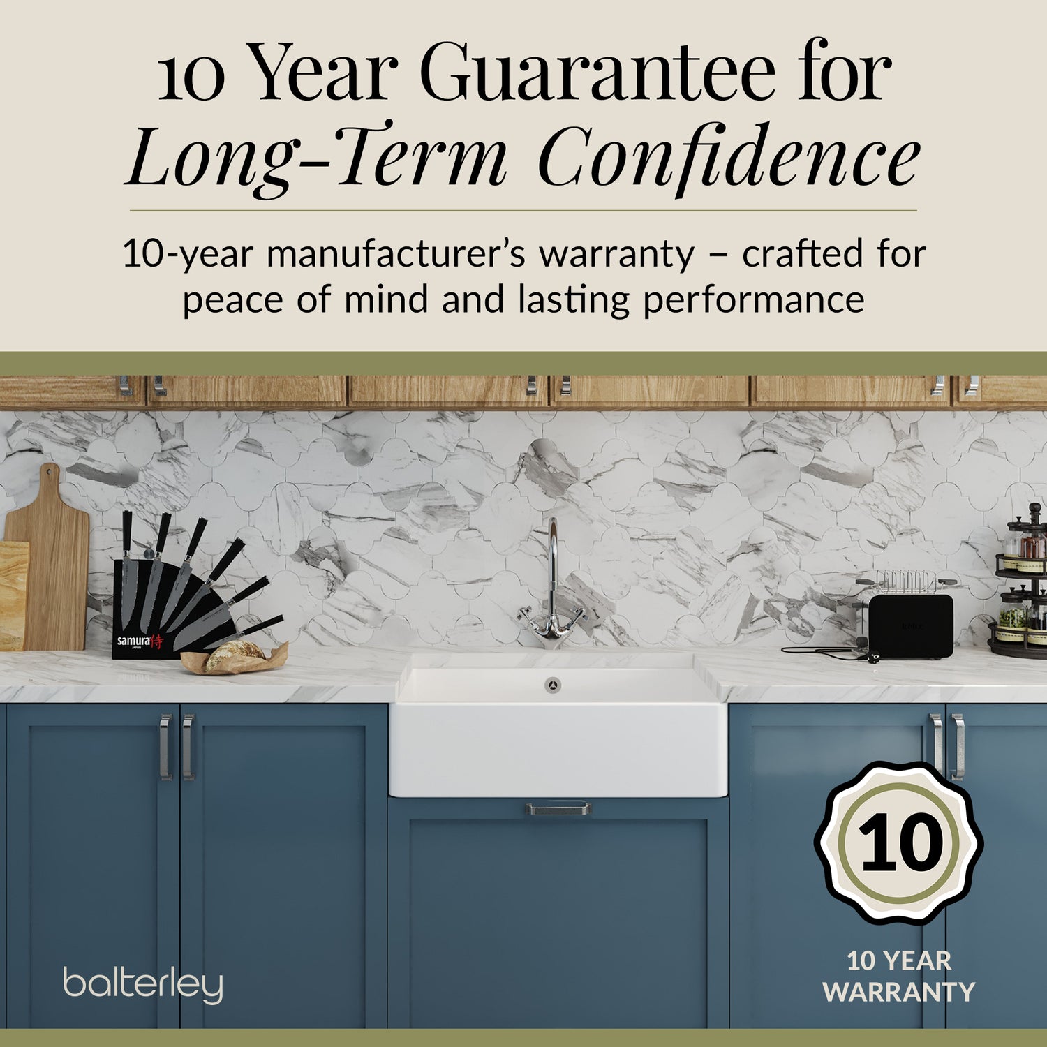 Elevate your kitchen with this 795mm Single Bowl Butler Kitchen Sink Bundle from Balterley. Handcrafted from premium fireclay, the sink provides a durable, smooth, non-porous surface that resists stains, chips, and scratches, making cleaning effortless and ensuring lasting quality. The pre-drilled integrated overflow adds peace of mind, while the Chrome mono crosshead mixer tap and matching basket strainer waste deliver reliable, coordinated performance for a stylish and practical kitchen feature.