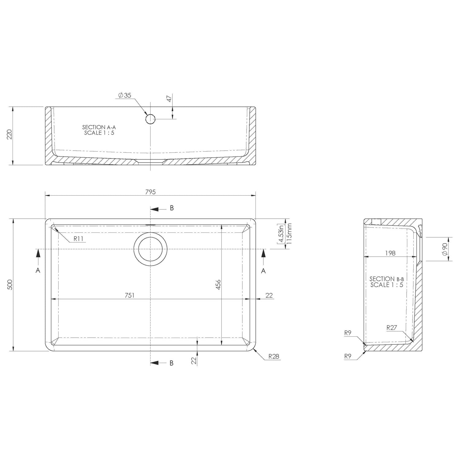 - Sink Dimensions: H 220mm x W 795mm x D 500mm