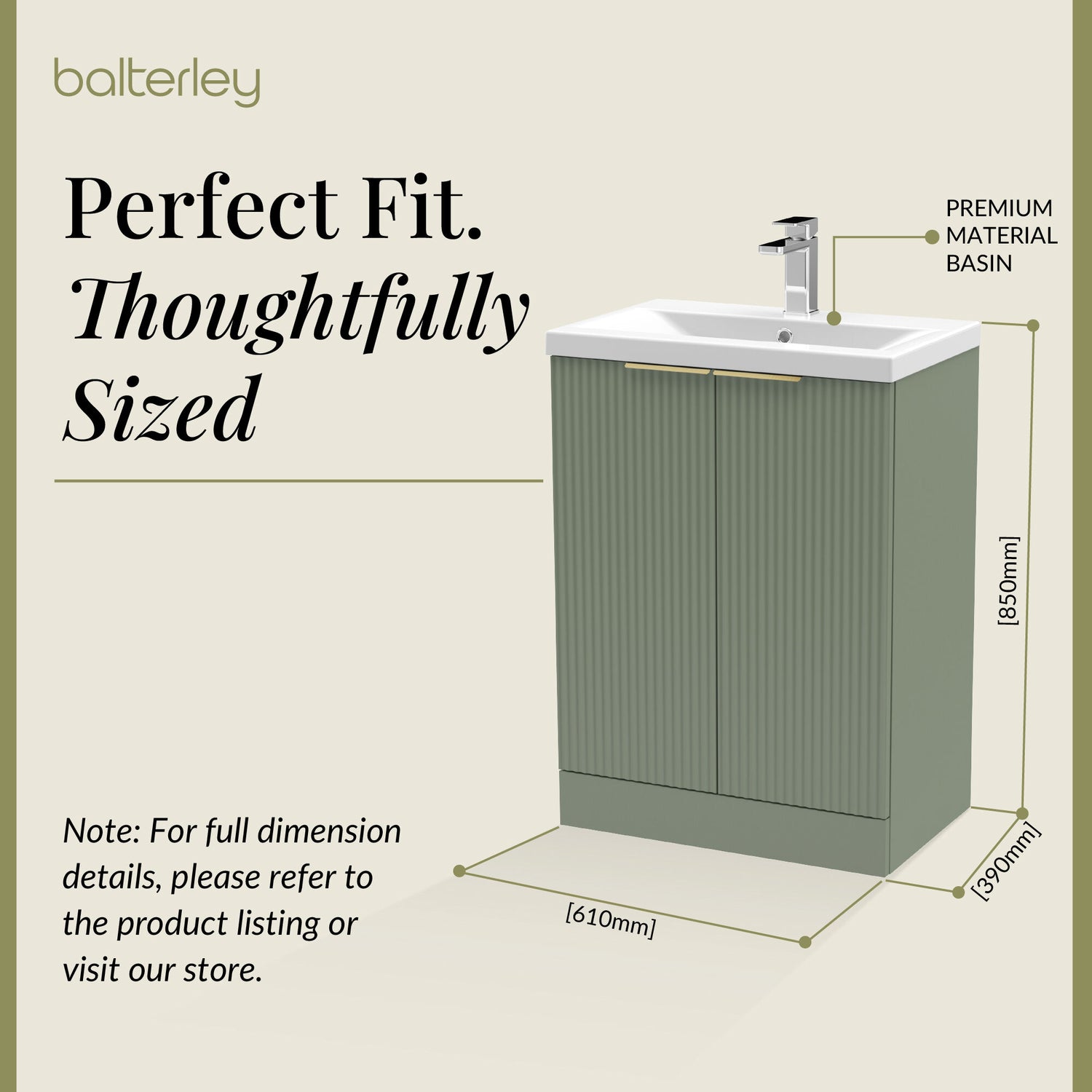 This floor-mounted vanity unit from Balterley blends timeless design with practical storage, making it an ideal addition to both traditional and modern bathrooms. Featuring signature fluted front detailing and a smooth satin finish, it delivers understated elegance while providing ample space behind its soft-close doors. Manufactured from high-quality materials for a durable finish, this unit is designed to be secured to the wall for added stability and a seamless, built-in look.