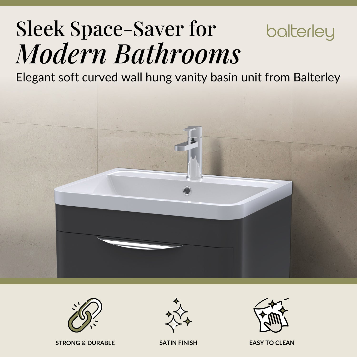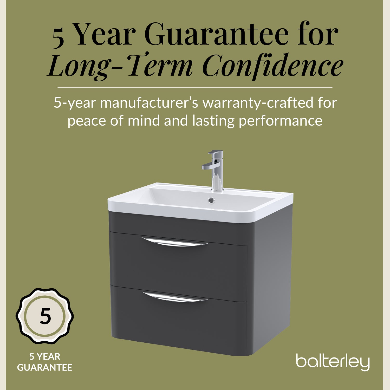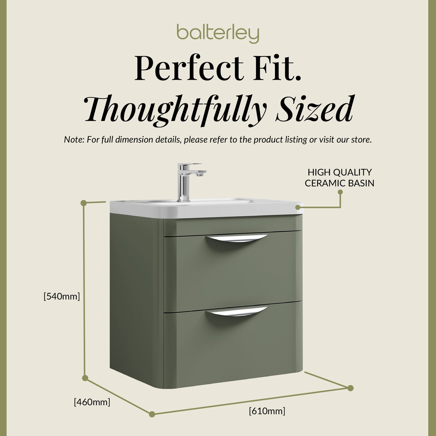 Bring tailored elegance and practical storage to your bathroom with the Balterley 600mm wall-hung 2-drawer vanity unit. Available in three striking finishes – Gloss White, Satin Green, and Satin Dark Grey – this unit is paired exclusively with a premium ceramic basin for a sleek, durable, and timeless look. The wall-mounted design creates a floating, airy effect while maximising floor space, and two soft-close drawers provide quiet, organised storage for everyday essentials. Supplied rigid and ready to install, this versatile vanity unit combines style, functionality, and convenience in one complete solution.