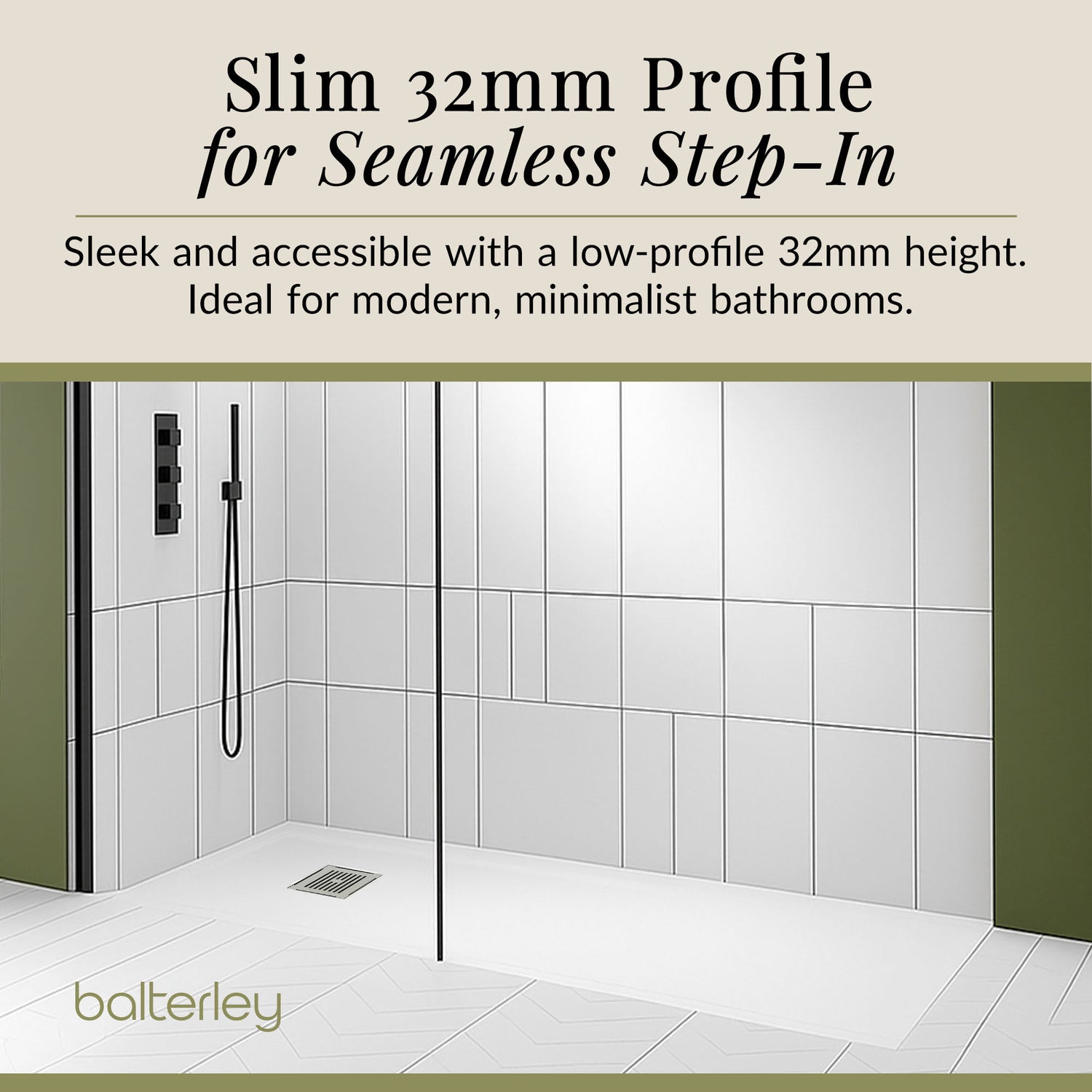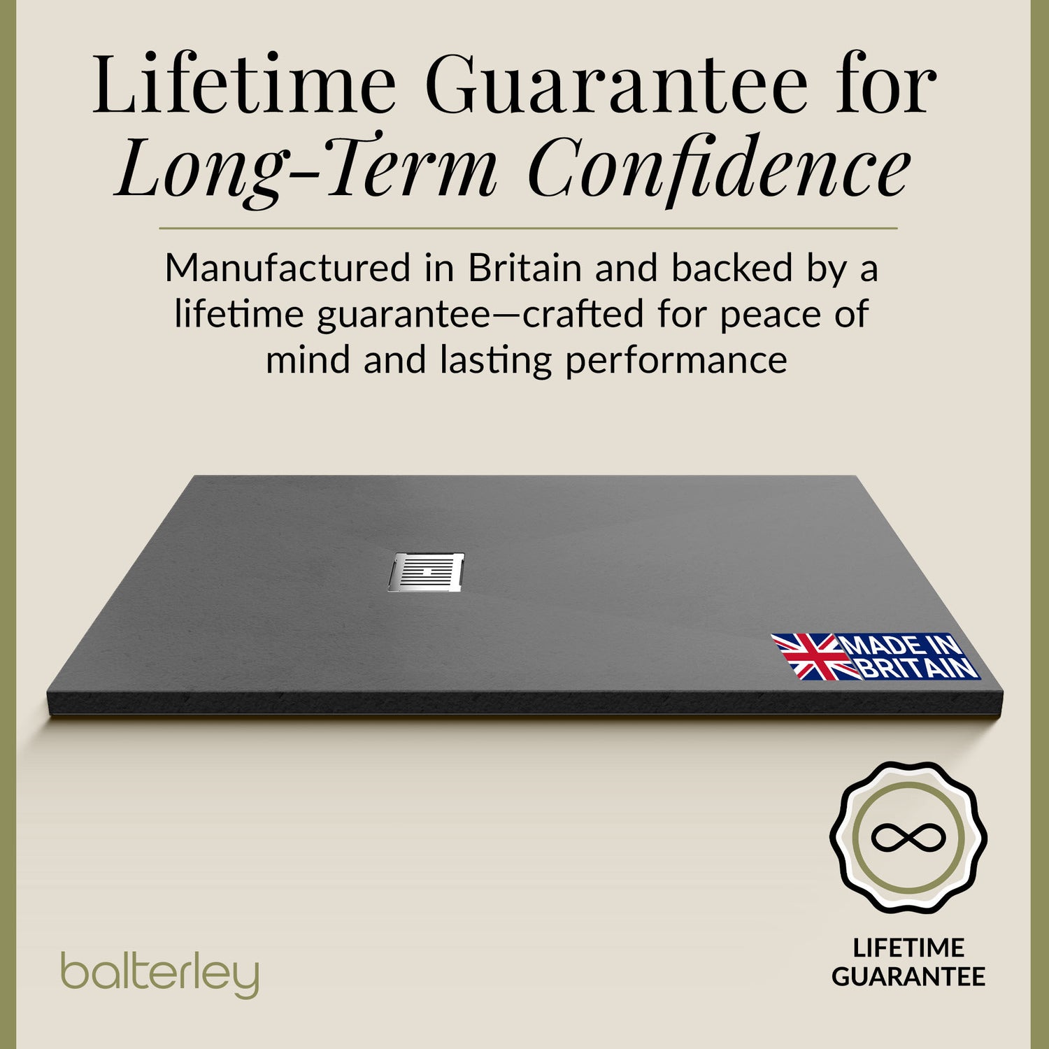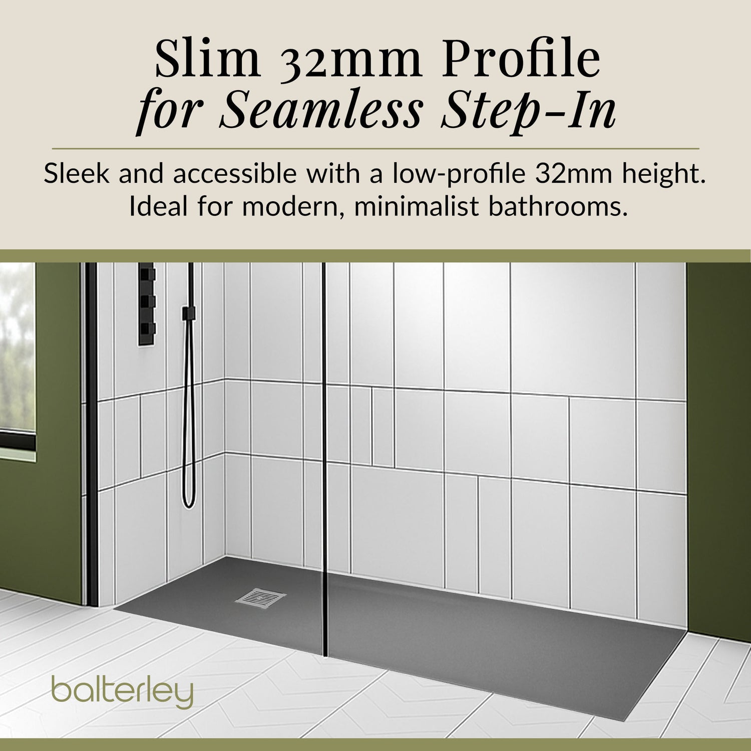 Designed and manufactured in Great Britain, the Balterley Rectangular Shower Tray brings together refined styling and everyday reliability. With its slim 32mm profile and bold, architectural lines, it provides the perfect foundation for a modern walk-in or enclosed shower space. Available in a choice of white, grey, or slate black, each tray features a beautifully textured slate-effect surface and is crafted from lightweight, high-performance resin — built to last and look good doing it.