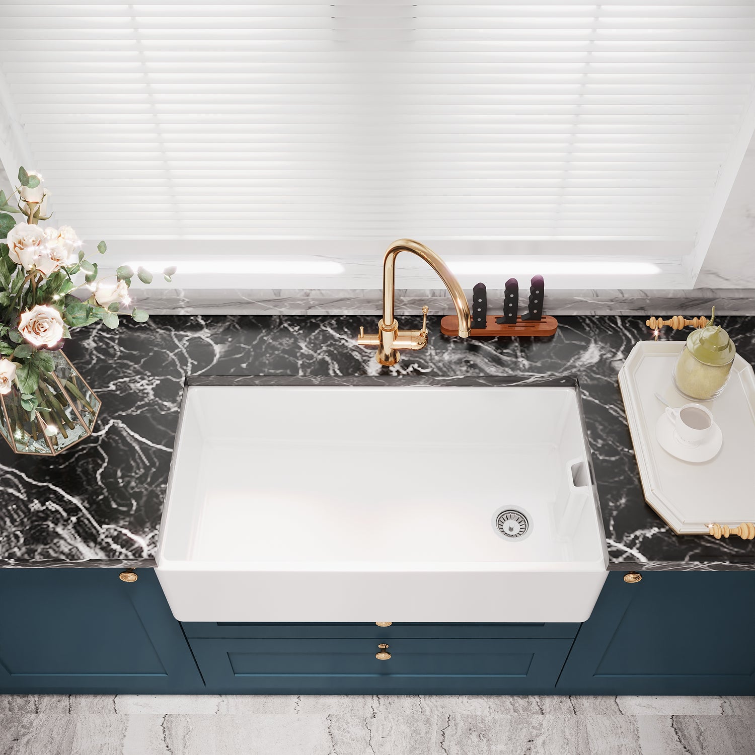 Single Bowl Fireclay Ceramic Belfast Kitchen Sink & Basket Strainer Waste