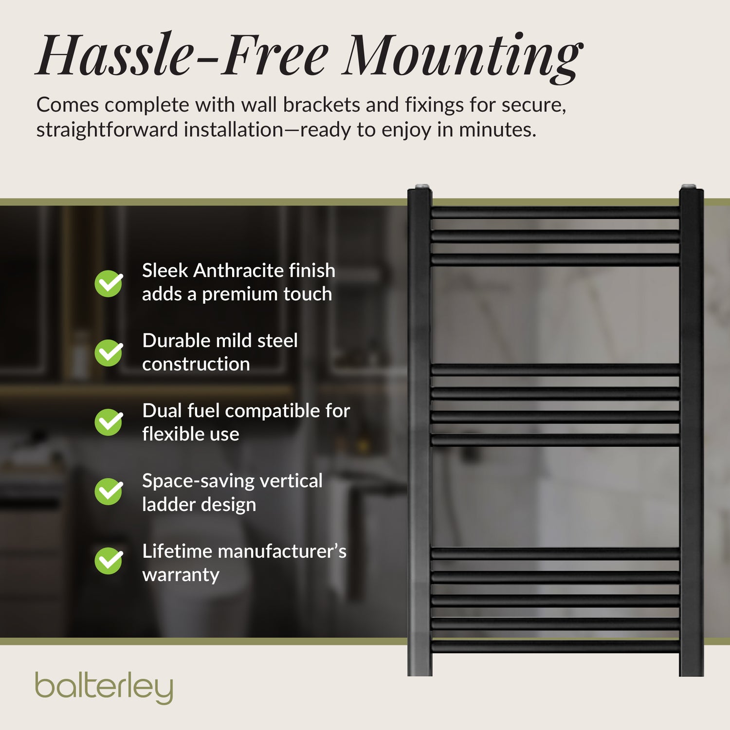 Enhance your bathroom with Balterley’s extensive range of Straight Heated Rail Dual Fuel Towel Warmers. Available in multiple sizes and finishes—including matte black, polished chrome, and anthracite—these towel warmers combine modern aesthetics with versatile, efficient heating. Designed with durable mild steel and finished with corrosion-resistant coatings, they offer space-saving profiles that deliver powerful warmth and quick towel drying to elevate bathroom comfort all year round.