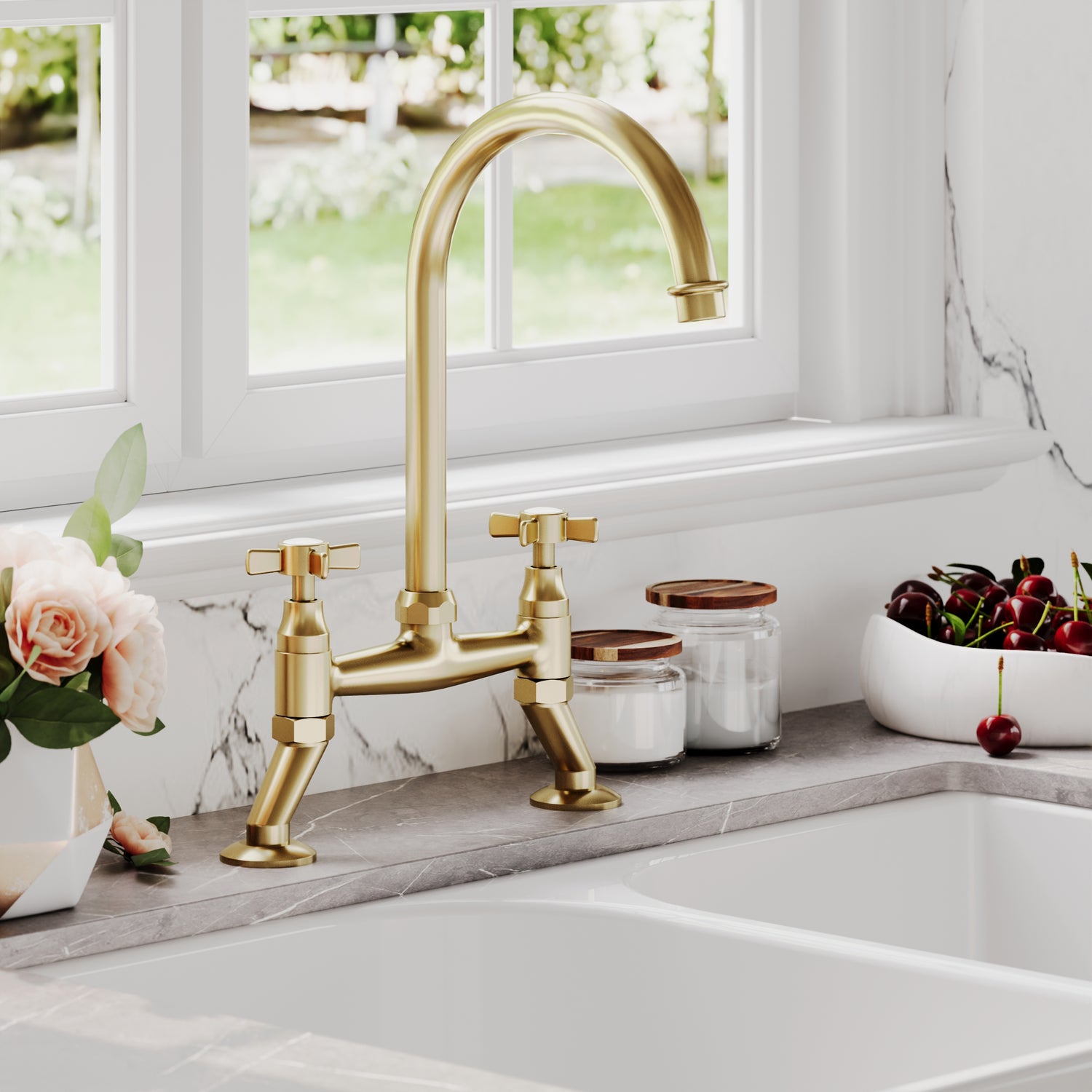 Enhance your kitchen with the Traditional Bridge Mixer Kitchen Tap from Balterley, combining timeless design with modern practicality. Featuring a classic bridge style and a choice of crosshead or lever handles, this tap adds a touch of elegance to any kitchen. Available in a range of finishes, including Chrome, Brushed Nickel, and Brushed Brass, it offers a versatile and stylish solution to suit traditional and contemporary kitchen decor alike.